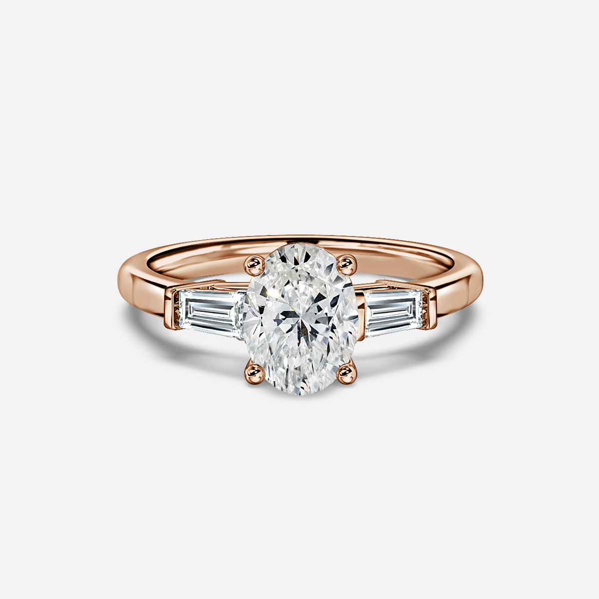 The Leela Rose Gold Trilogy Engagement Ring features a center diamond flanked by two baguette diamonds on each side, representing the journey of love. Handcrafted in Hatton Gardens, London, this setting-only piece is a timeless choice for an unforgettable proposal, with the center diamond to be selected separately.