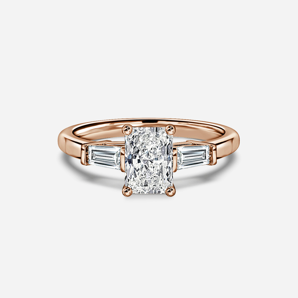 The Leela Rose Gold Trilogy Engagement Ring features a center diamond flanked by two baguette diamonds on each side, representing the journey of love. Handcrafted in Hatton Gardens, London, this setting-only piece is a timeless choice for an unforgettable proposal, with the center diamond to be selected separately.