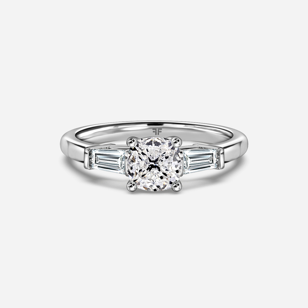 The Leela White Gold Trilogy Engagement Ring features a center diamond flanked by two baguette diamonds on each side, representing the journey of love. Handcrafted in Hatton Gardens, London, this setting-only piece is a timeless choice for an unforgettable proposal, with the center diamond to be selected separately.