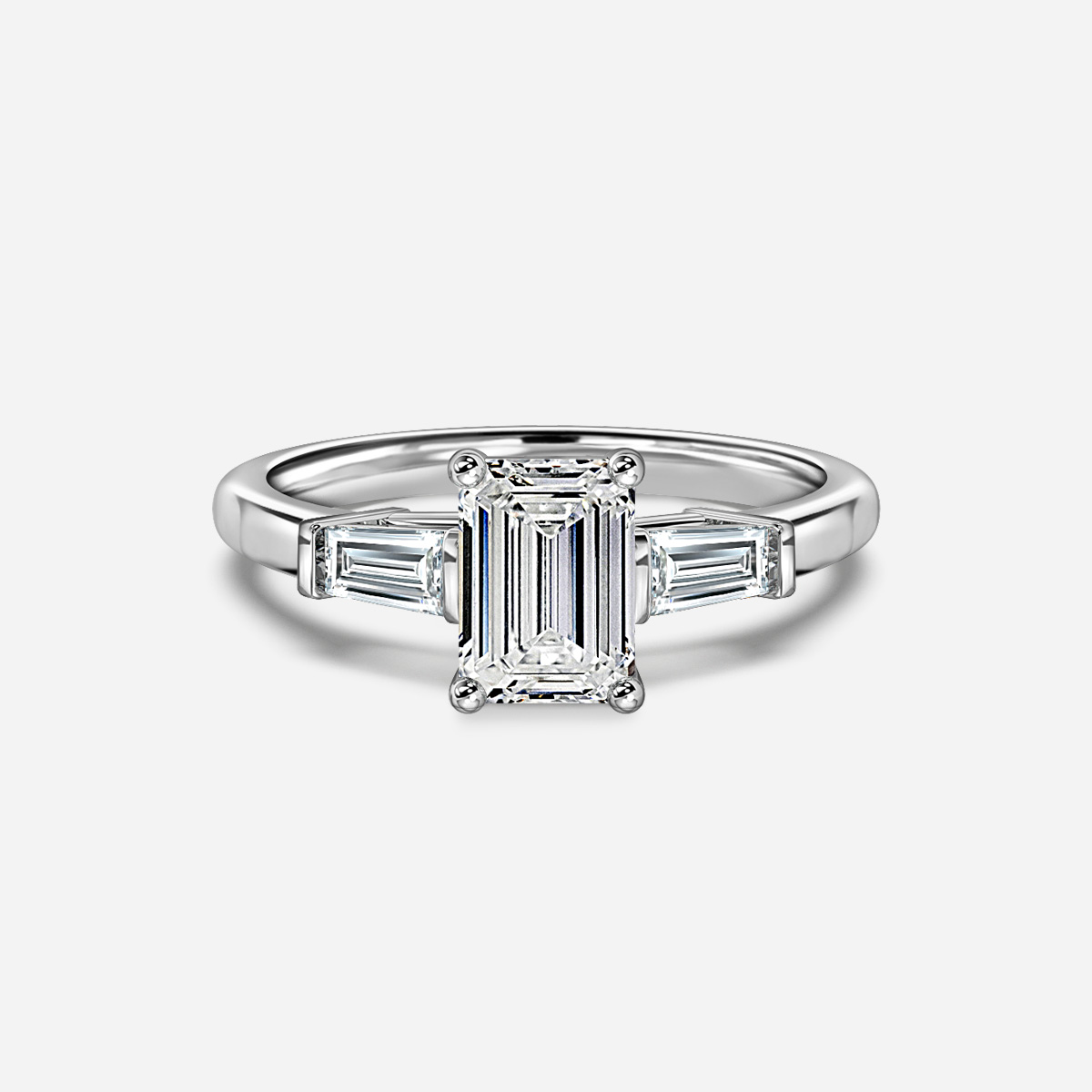 The Leela White Gold Trilogy Engagement Ring features a center diamond flanked by two baguette diamonds on each side, representing the journey of love. Handcrafted in Hatton Gardens, London, this setting-only piece is a timeless choice for an unforgettable proposal, with the center diamond to be selected separately.