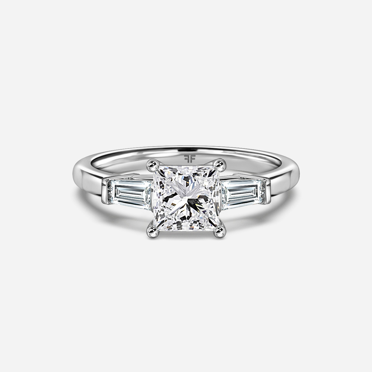 The Leela White Gold Trilogy Engagement Ring features a center diamond flanked by two baguette diamonds on each side, representing the journey of love. Handcrafted in Hatton Gardens, London, this setting-only piece is a timeless choice for an unforgettable proposal, with the center diamond to be selected separately.