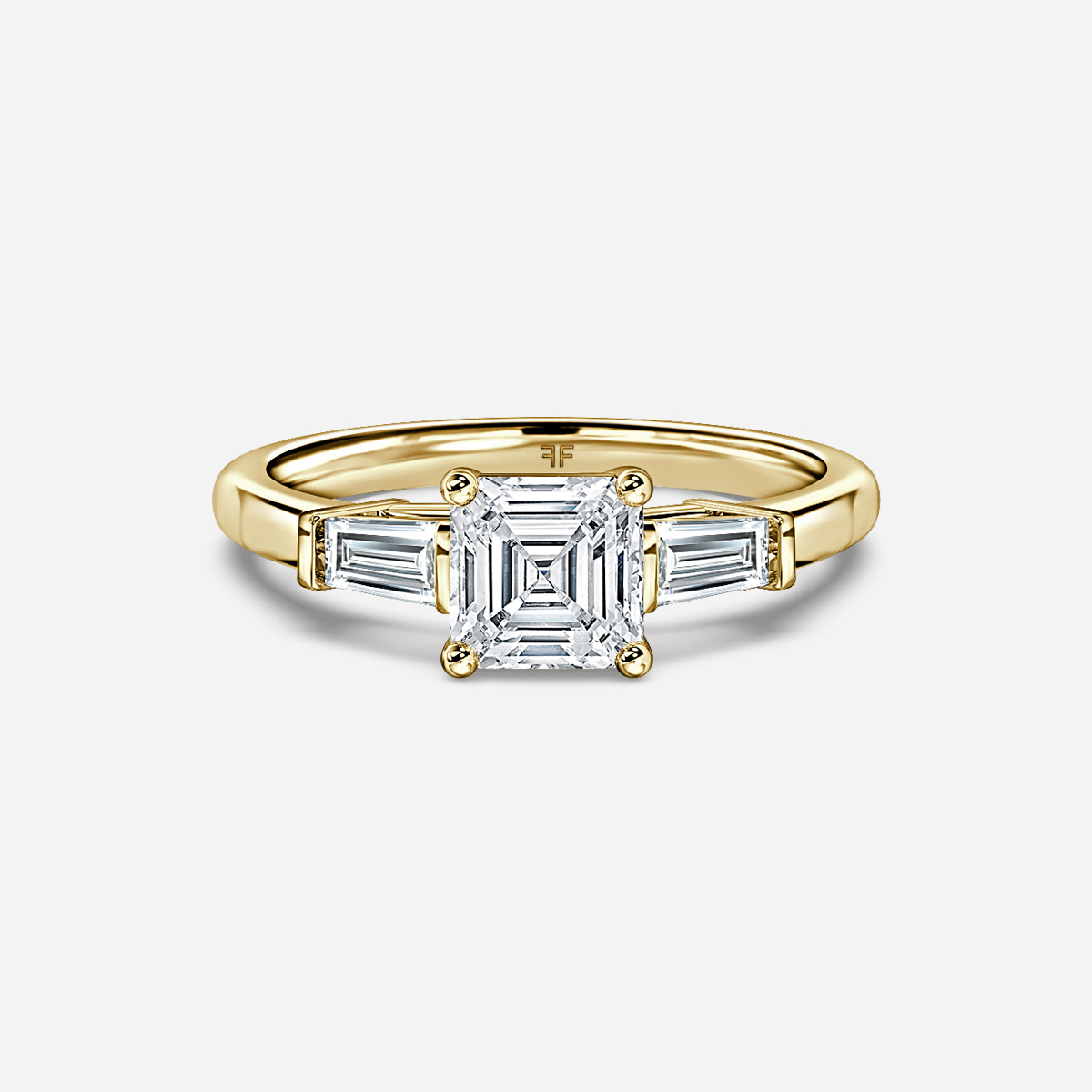 The Leela Yellow Gold Trilogy Engagement Ring features a center diamond flanked by two baguette diamonds on each side, representing the journey of love. Handcrafted in Hatton Gardens, London, this setting-only piece is a timeless choice for an unforgettable proposal, with the center diamond to be selected separately.