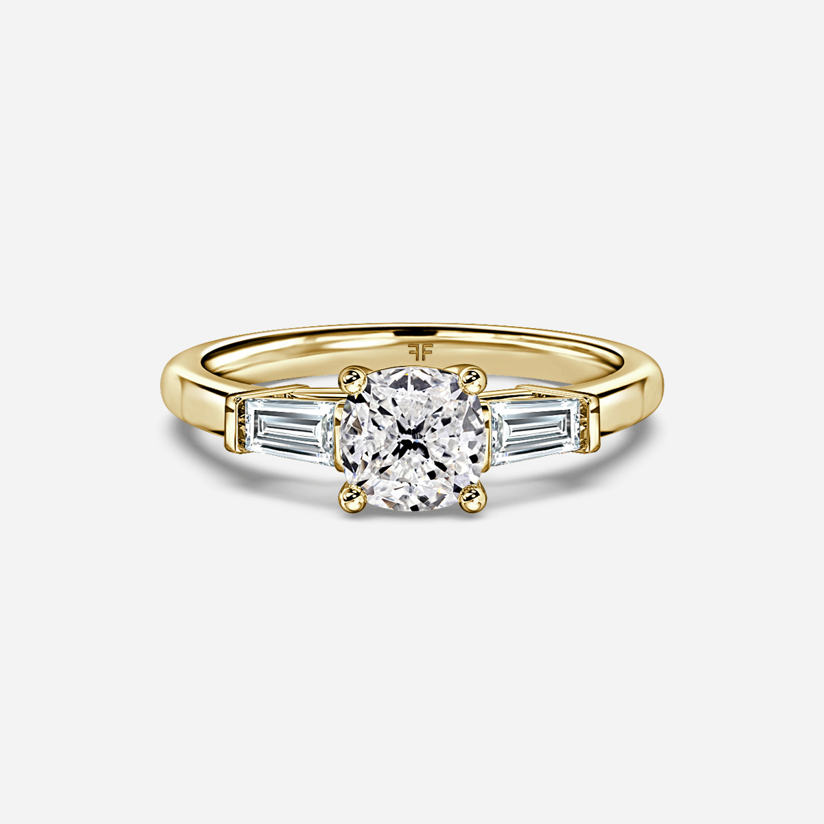 The Leela Yellow Gold Trilogy Engagement Ring features a center diamond flanked by two baguette diamonds on each side, representing the journey of love. Handcrafted in Hatton Gardens, London, this setting-only piece is a timeless choice for an unforgettable proposal, with the center diamond to be selected separately.