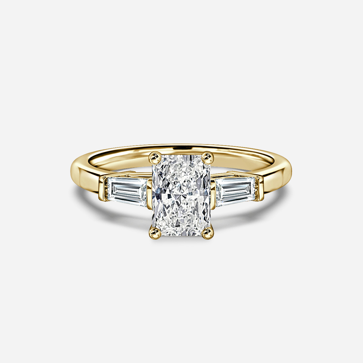 The Leela Yellow Gold Trilogy Engagement Ring features a center diamond flanked by two baguette diamonds on each side, representing the journey of love. Handcrafted in Hatton Gardens, London, this setting-only piece is a timeless choice for an unforgettable proposal, with the center diamond to be selected separately.