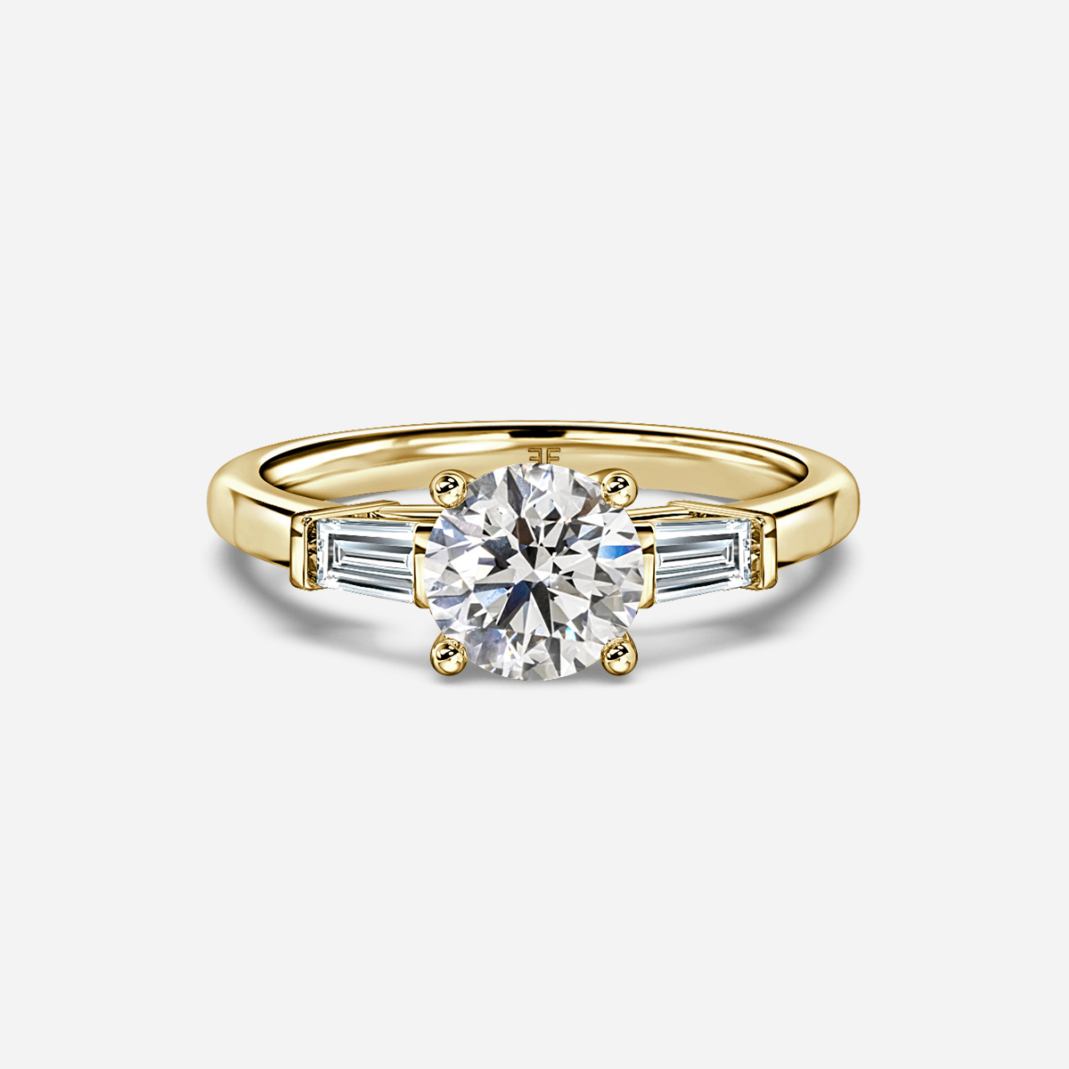 The Leela Yellow Gold Trilogy Engagement Ring features a center diamond flanked by two baguette diamonds on each side, representing the journey of love. Handcrafted in Hatton Gardens, London, this setting-only piece is a timeless choice for an unforgettable proposal, with the center diamond to be selected separately.