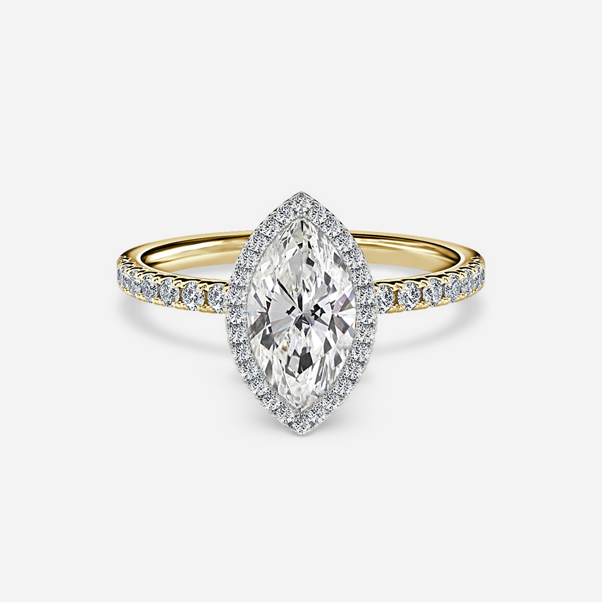 This yellow gold two tone halo engagement ring features diamond accents and a delicate lotus basket. It's a timeless, unique piece. Handcrafted in Hatton Gardens, London. Centre Diamond Not Included Setting only