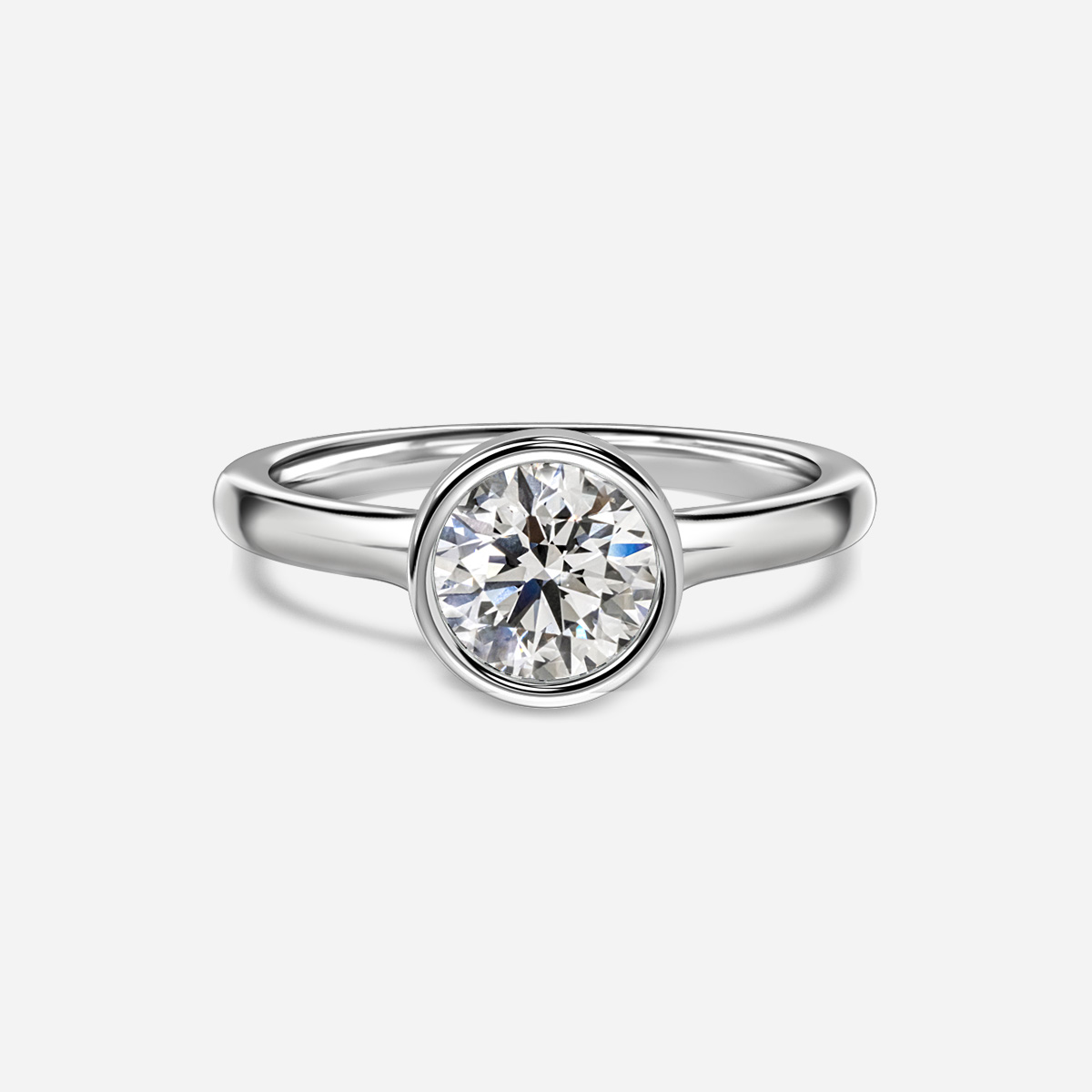 The London ring in platinum offers a striking solitaire style with a clean bezel setting. The luminous metal and smooth band enhance its contemporary elegance, making it a durable and timeless choice for a refined and graceful look. Handcrafted in Hatton Gardens, London. Diamond Center Not Included Setting Only