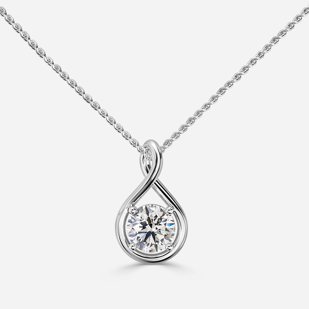The Lucy Infinity Solitaire Pendant showcases a refined infinity-inspired setting, elegantly embracing a brilliant diamond as a symbol of eternal love. Expertly crafted in white gold, it embodies timeless sophistication and grace. Handcrafted in Hatton Gardens, London. Setting Only