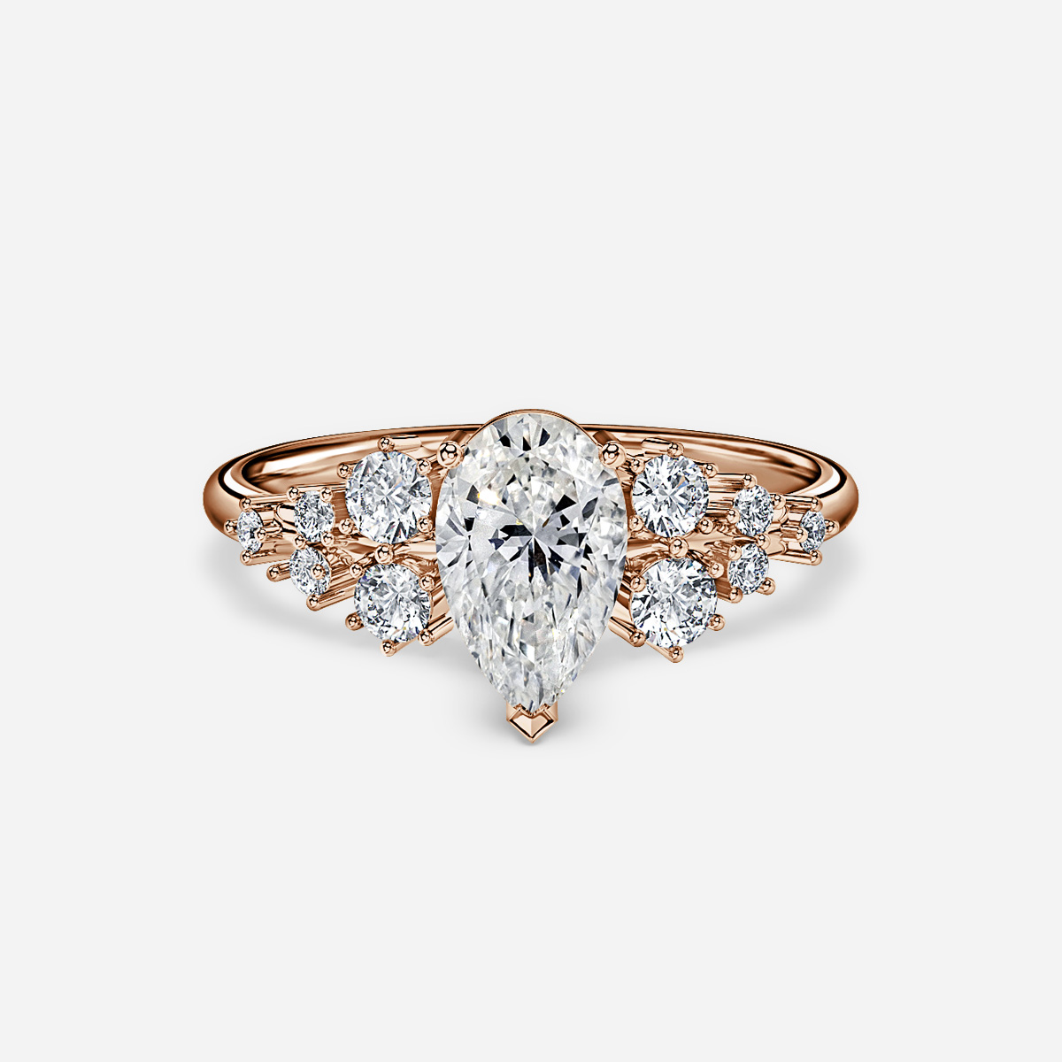 A rose gold cluster engagement ring features side stones are set in a triangular shape, creating a unique and eye-catching look that wraps around the main center diamond. This creates a distinct and luxurious look that will be sure to stand out from the crowd. Handcrafted in Hatton Gardens, London. Centre Diamond Not Included Setting Only