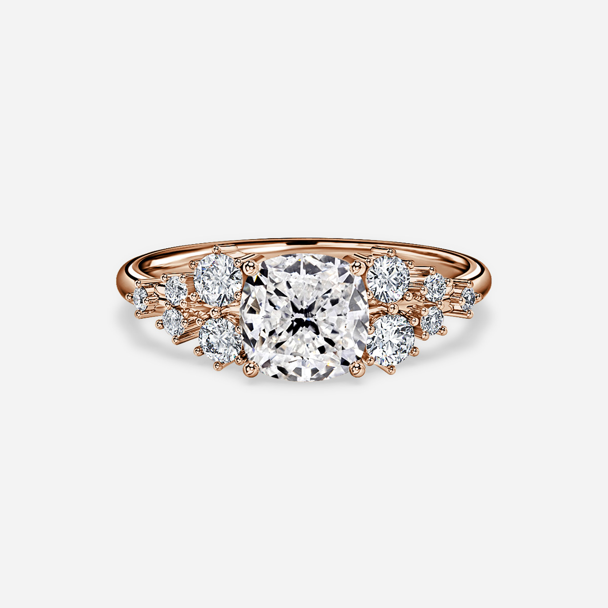 A rose gold unique engagement ring features side stones are set in a triangular shape, creating a unique and eye-catching look that wraps around the main center diamond. This creates a distinct and luxurious look that will be sure to stand out from the crowd. Handcrafted in Hatton Gardens, London. Centre Diamond Not Included Setting Only
