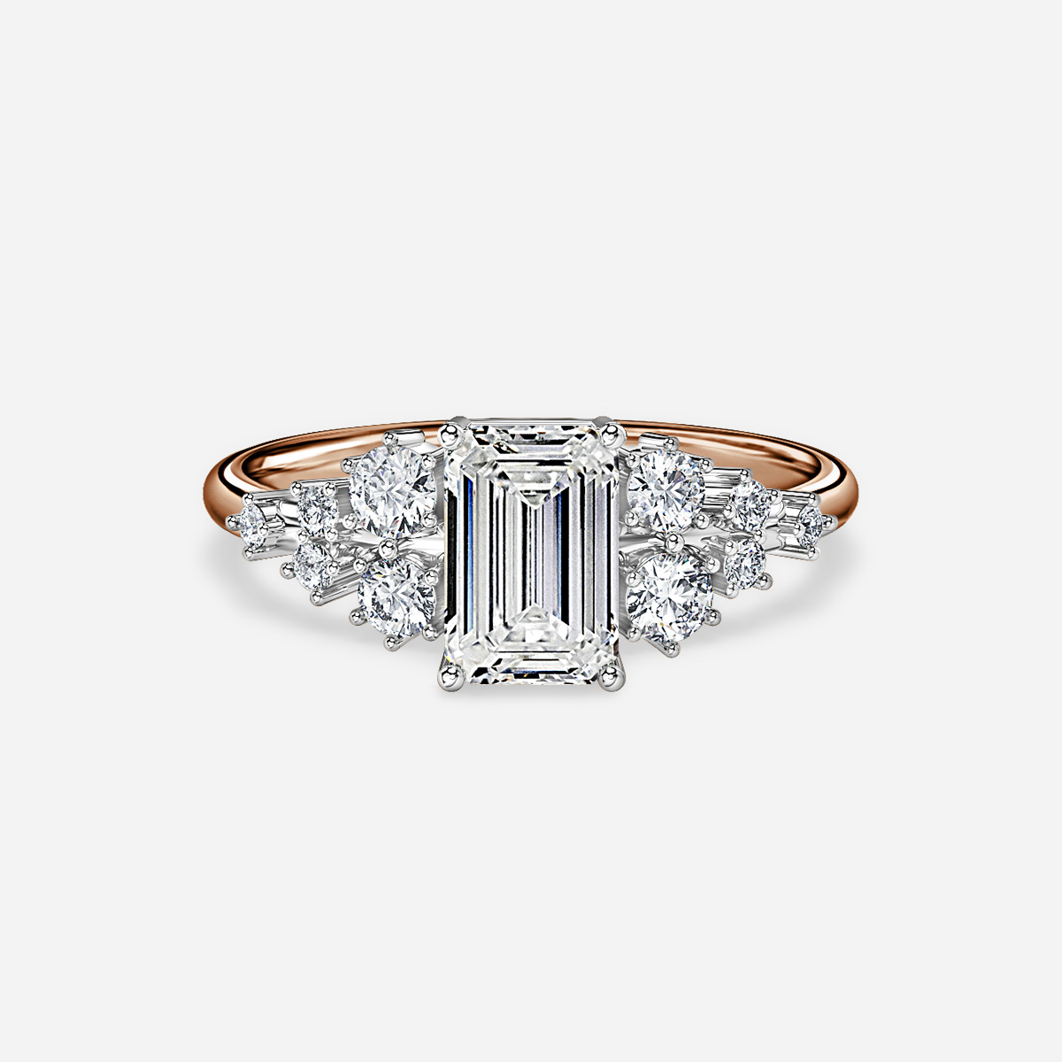 A rose gold two tone unique engagement ring features side stones are set in a triangular shape, creating a unique and eye-catching look that wraps around the main center diamond. This creates a distinct and luxurious look that will be sure to stand out from the crowd. Handcrafted in Hatton Gardens, London. Centre Diamond Not Included Setting Only