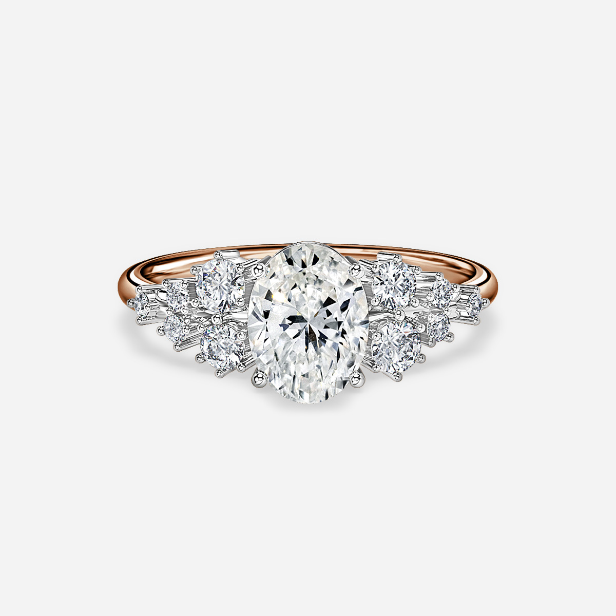 A rose gold two tone unique engagement ring features side stones are set in a triangular shape, creating a unique and eye-catching look that wraps around the main center diamond. This creates a distinct and luxurious look that will be sure to stand out from the crowd. Handcrafted in Hatton Gardens, London. Centre Diamond Not Included Setting Only