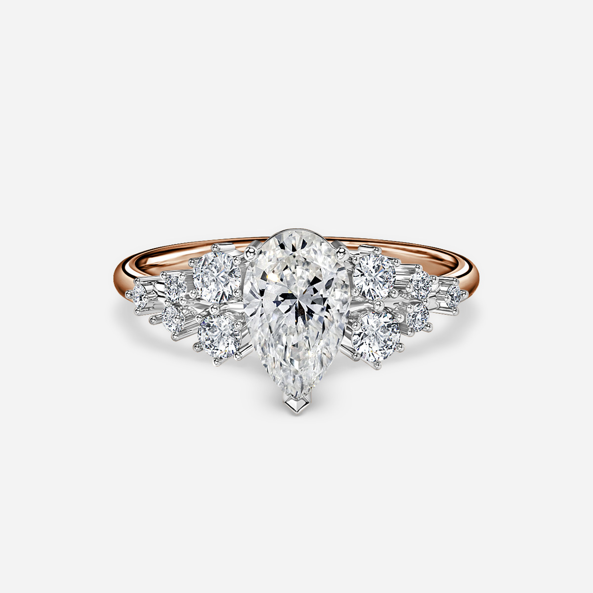 A rose gold two tone unique engagement ring features side stones are set in a triangular shape, creating a unique and eye-catching look that wraps around the main center diamond. This creates a distinct and luxurious look that will be sure to stand out from the crowd. Handcrafted in Hatton Gardens, London. Centre Diamond Not Included Setting Only