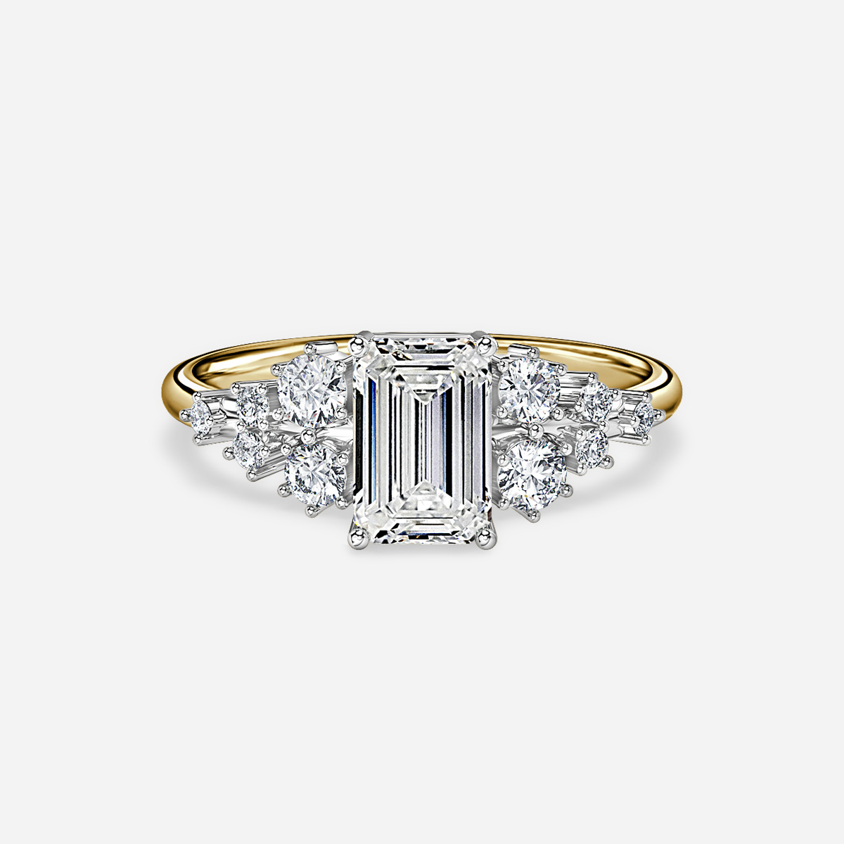 A yellow gold two tone unique engagement ring features side stones are set in a triangular shape, creating a unique and eye-catching look that wraps around the main center diamond. This creates a distinct and luxurious look that will be sure to stand out from the crowd. Handcrafted in Hatton Gardens, London. Centre Diamond Not Included Setting Only