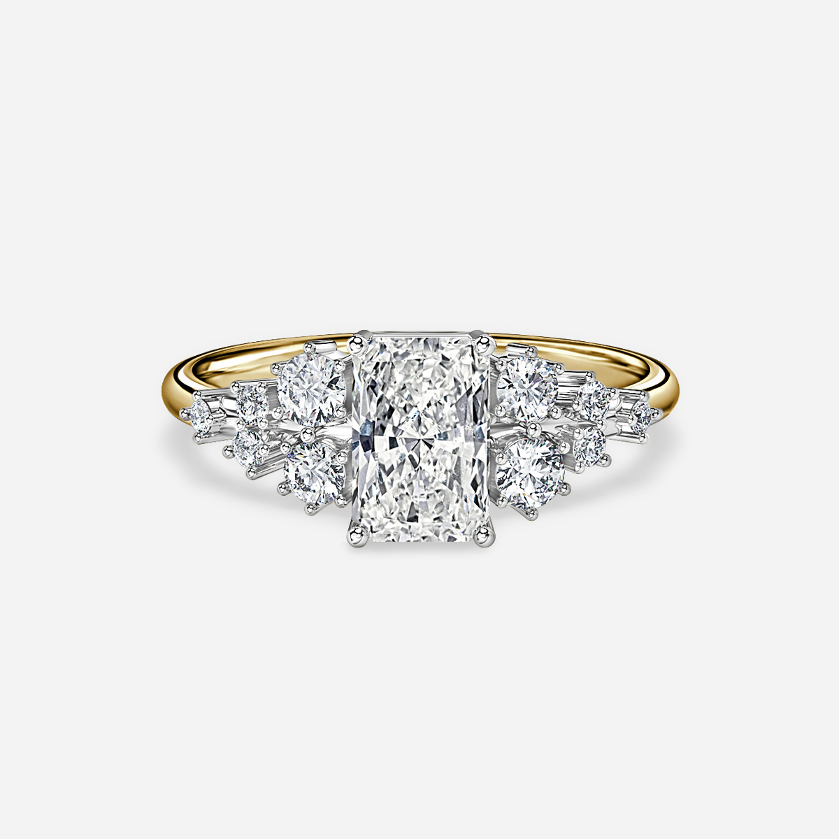 A yellow gold two tone unique engagement ring features side stones are set in a triangular shape, creating a unique and eye-catching look that wraps around the main center diamond. This creates a distinct and luxurious look that will be sure to stand out from the crowd. Handcrafted in Hatton Gardens, London. Centre Diamond Not Included Setting Only