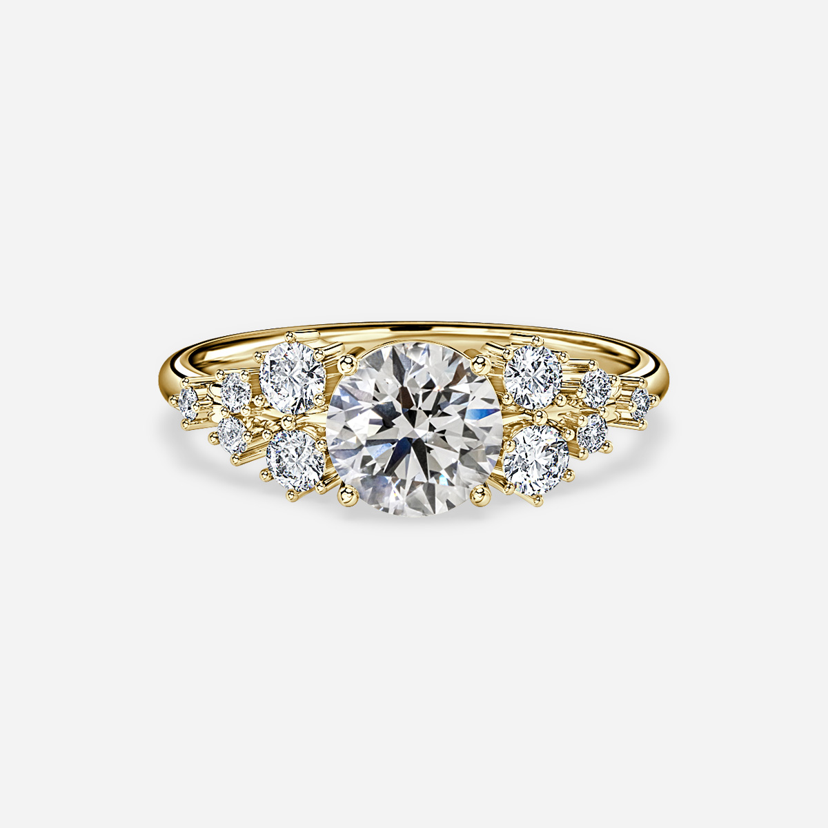 A yellow gold unique engagement ring features side stones are set in a triangular shape, creating a unique and eye-catching look that wraps around the main center diamond. This creates a distinct and luxurious look that will be sure to stand out from the crowd. Handcrafted in Hatton Gardens, London. Centre Diamond Not Included Setting Only