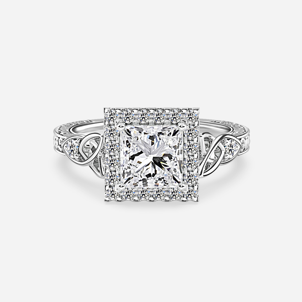 This elegant Celtic halo engagement ring features intricate carvings and is adorned with a dazzling diamond on each side. The perfect choice for those who appreciate timeless sophistication and unique design. Handcrafted in Hatton Garden, London Centre Diamond Not Included Setting Only