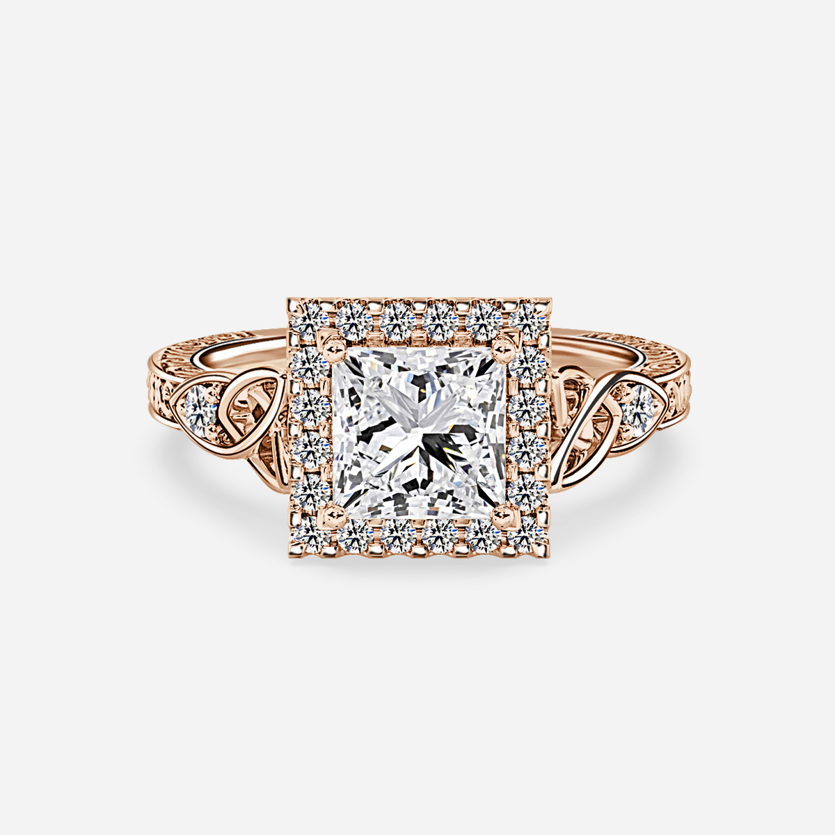 This elegant Celtic halo engagement ring features intricate carvings and is adorned with a dazzling diamond on each side. The perfect choice for those who appreciate timeless sophistication and unique design. Handcrafted in Hatton Garden, London Centre Diamond Not Included Setting Only
