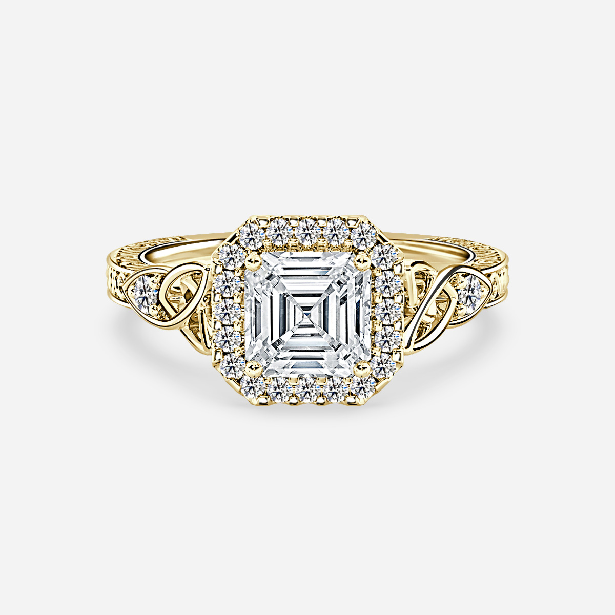 This elegant Celtic halo engagement ring features intricate carvings and is adorned with a dazzling diamond on each side. The perfect choice for those who appreciate timeless sophistication and unique design. Handcrafted in Hatton Garden, London Centre Diamond Not Included Setting Only