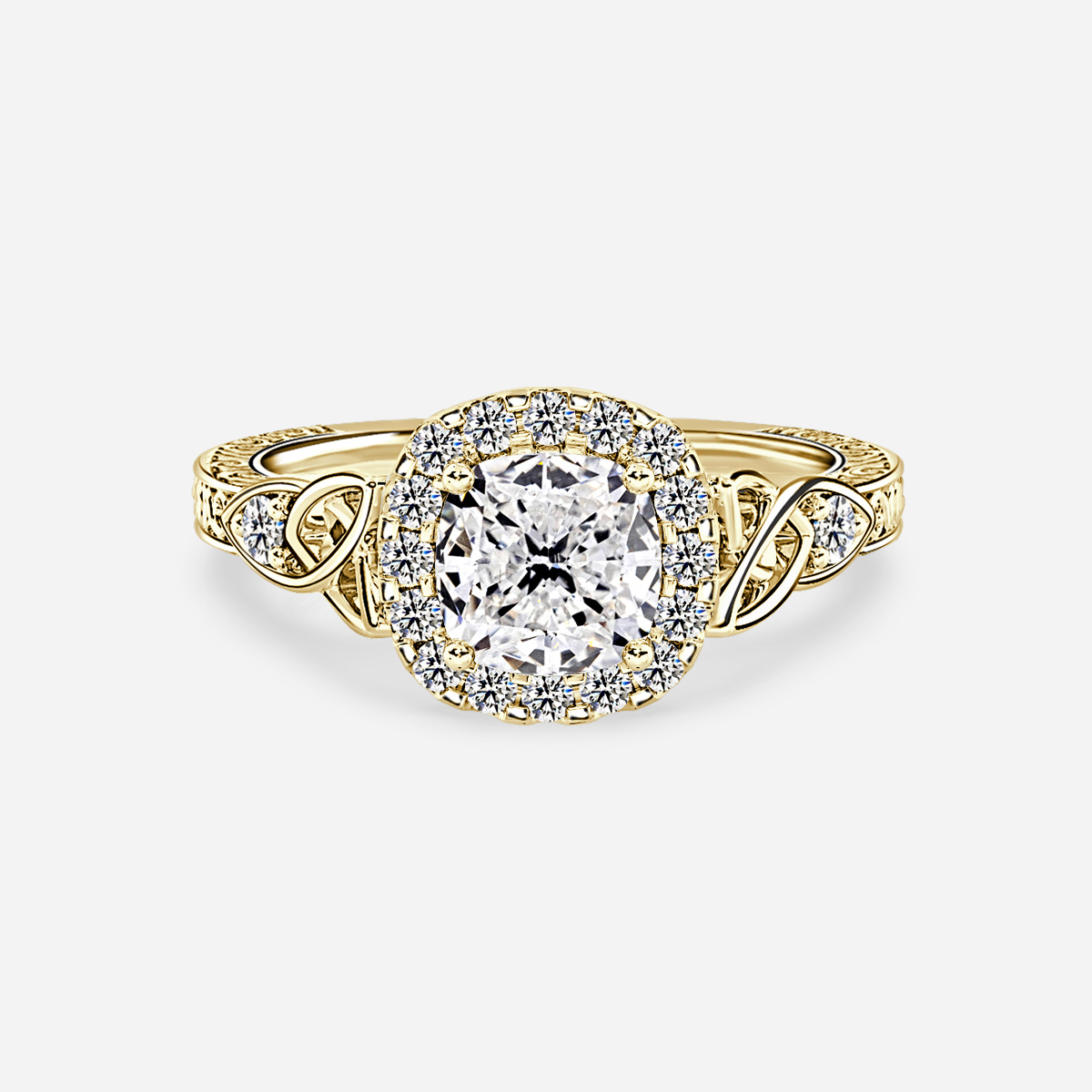 This elegant Celtic halo engagement ring features intricate carvings and is adorned with a dazzling diamond on each side. The perfect choice for those who appreciate timeless sophistication and unique design. Handcrafted in Hatton Garden, London Centre Diamond Not Included Setting Only