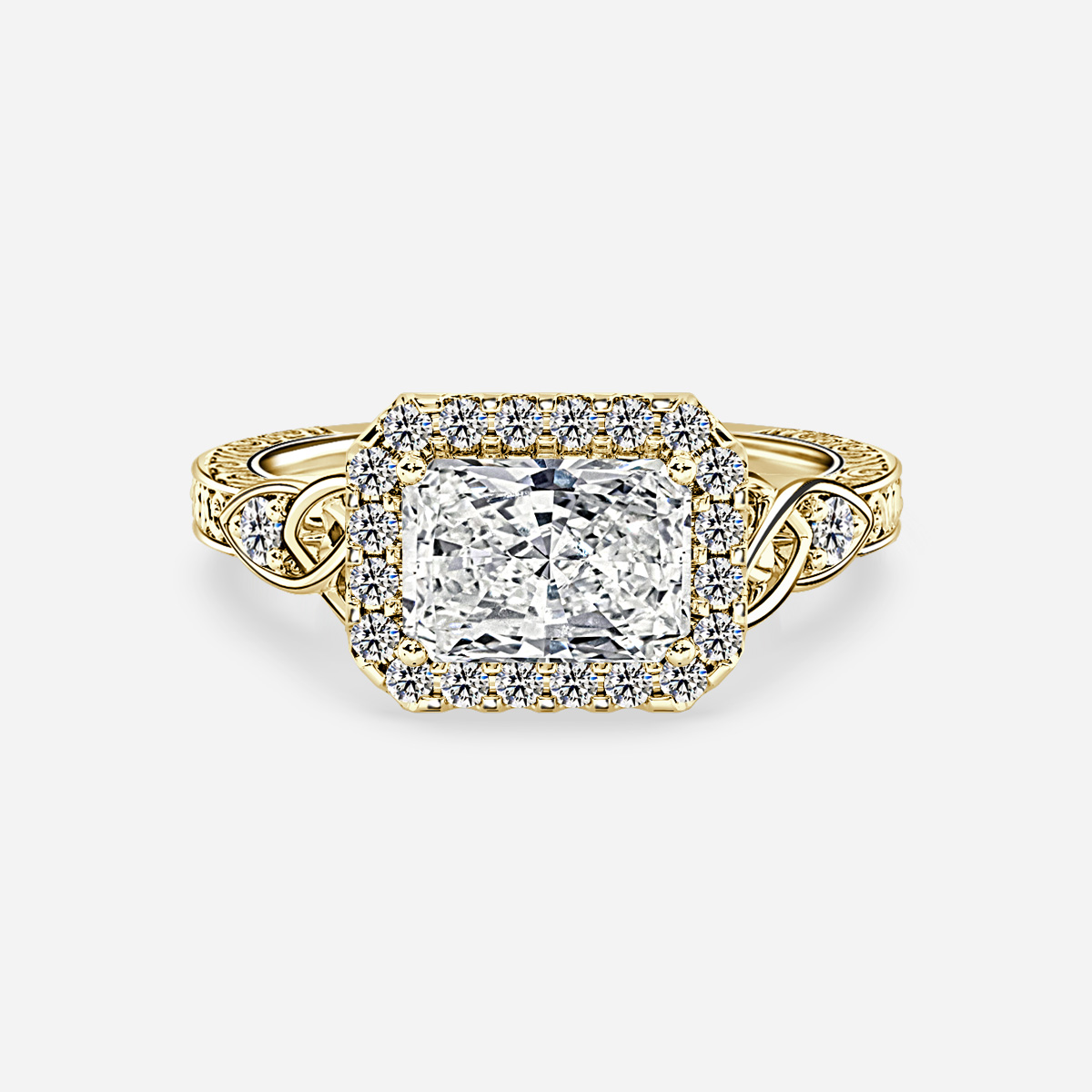 This elegant Celtic halo engagement ring features intricate carvings and is adorned with a dazzling diamond on each side. The perfect choice for those who appreciate timeless sophistication and unique design. Handcrafted in Hatton Garden, London Centre Diamond Not Included Setting Only