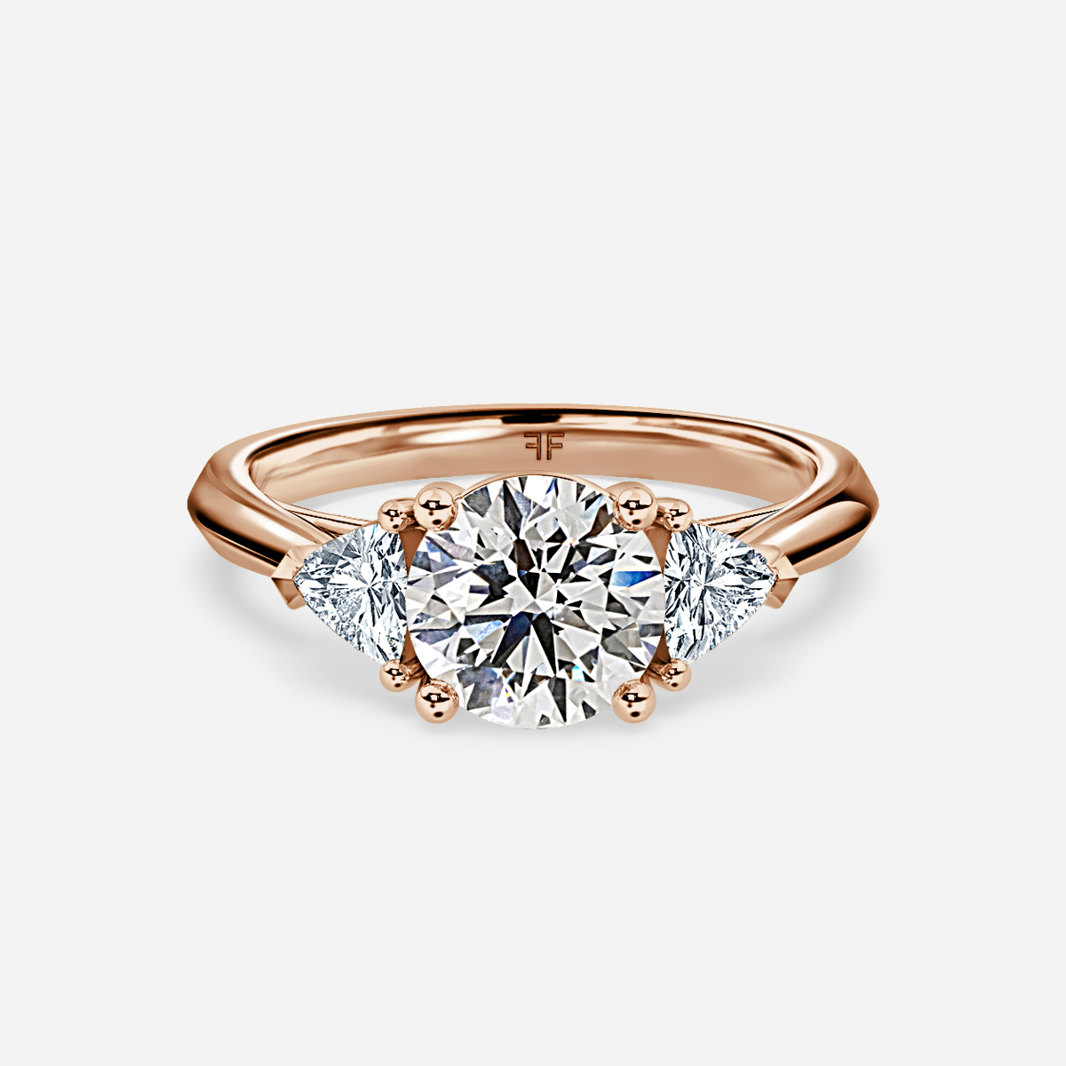 The rose gold trilogy engagement ring showcases a stunning triangular diamond on each side, bringing a unique and modern touch to a classic design. This ring is a symbol of timeless love that will last a lifetime. Handcrafted in Hatton Gardens, London. Centre Diamond Not Included Setting Only