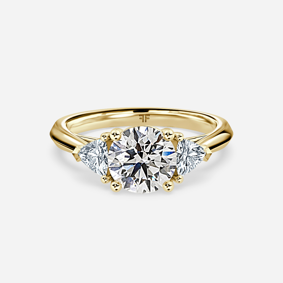 The yellow gold trilogy engagement ring showcases a stunning triangular diamond on each side, bringing a unique and modern touch to a classic design. This ring is a symbol of timeless love that will last a lifetime. Handcrafted in Hatton Gardens, London. Diamond Center Not Included Setting Only