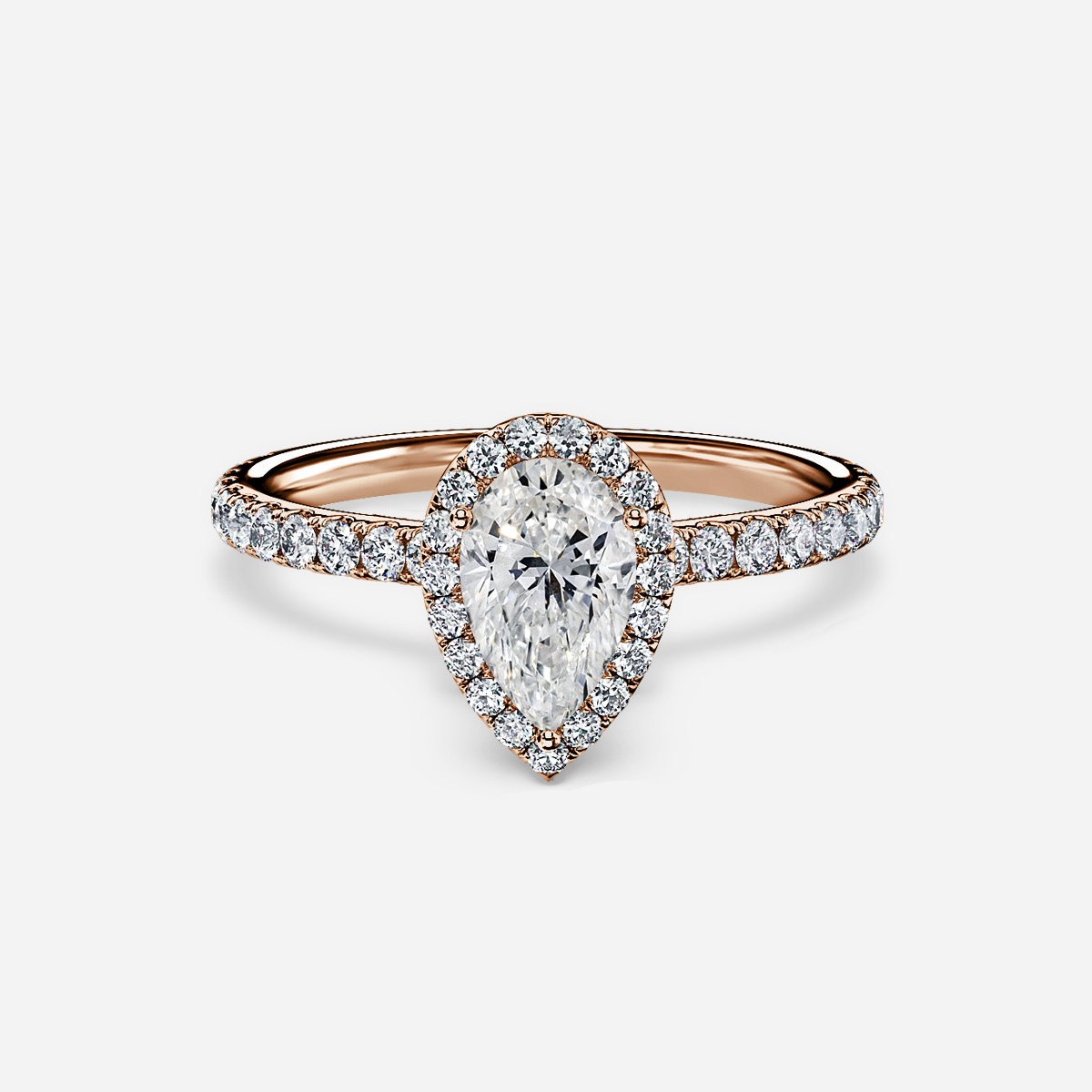 The Maya is a halo design with a border of brilliant diamonds set around the centre stone. It magnifies any shape into a spectacular centerpiece but particularly the curves and point of a pear shape or the octagonal brilliance of a radiant shaped diamond. Handcrafted in Hatton Garden, London. Centre Diamond Not Included, Setting only.