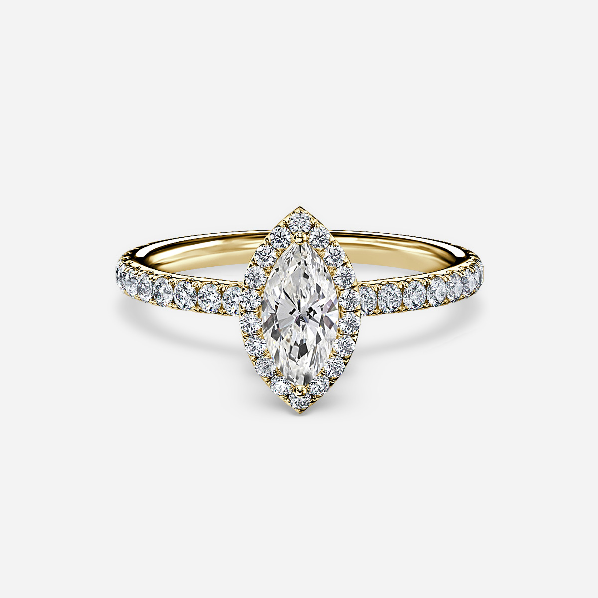 The Maya is a halo design with a border of brilliant diamonds set around the centre stone. It magnifies any shape into a spectacular centerpiece but particularly the curves and point of a pear shape or the octagonal brilliance of a radiant shaped diamond. Handcrafted in Hatton Garden, London. Centre Diamond Not Included, Setting only.