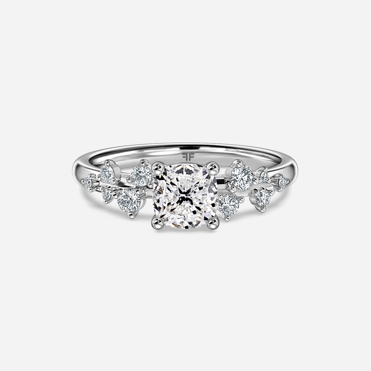 The Morning Star Platinum Cluster Engagement Ring showcases a band adorned with diamonds that elegantly diminish in size from the central diamond, set in gleaming platinum. The design beautifully accentuates the brilliance of the center diamond, creating a timeless and refined aesthetic. A symbol of enduring love and commitment. Handcrafted in Hatton Gardens, London. Centre Diamond Not Included Setting Only