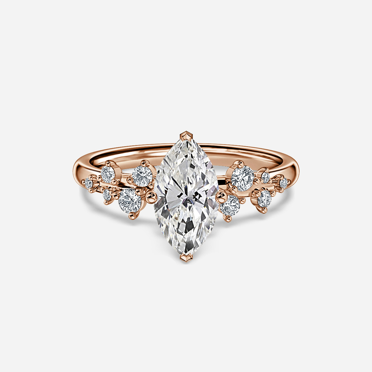 The Morning Star Rose Gold Unique Engagement Ring features a central diamond elegantly framed by a sophisticated chevron pattern of side diamonds that gradually taper in size from the center, enhancing the ring’s dynamic brilliance and refined allure. Handcrafted in Hatton Gardens, London. Centre Diamond Not Included Setting Only