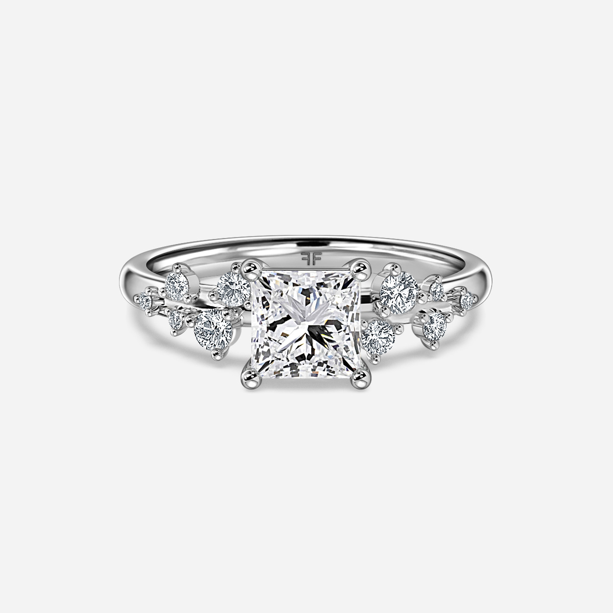 The Morning Star White Gold Unique Engagement Ring features a central diamond elegantly framed by a sophisticated chevron pattern of side diamonds that gradually taper in size from the center, enhancing the ring’s dynamic brilliance and refined allure. Handcrafted in Hatton Gardens, London. Centre Diamond Not Included Setting Only