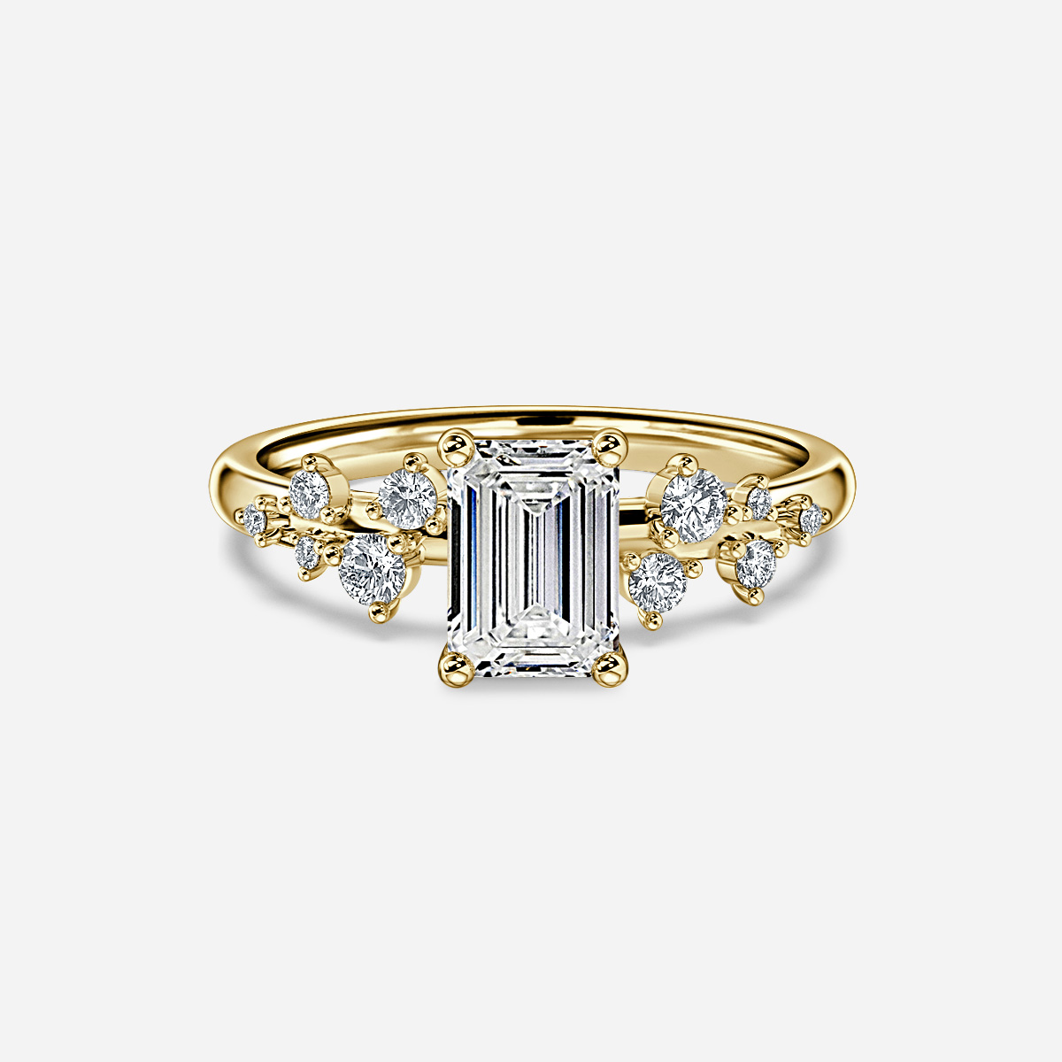 The Morning Star Yellow Gold Trilogy Engagement Ring features a central diamond elegantly framed by a sophisticated chevron pattern of side diamonds that gradually taper in size from the center, enhancing the ring's dynamic brilliance and refined allure. Handcrafted in Hatton Gardens, London. Diamond Center Not Included Setting Only