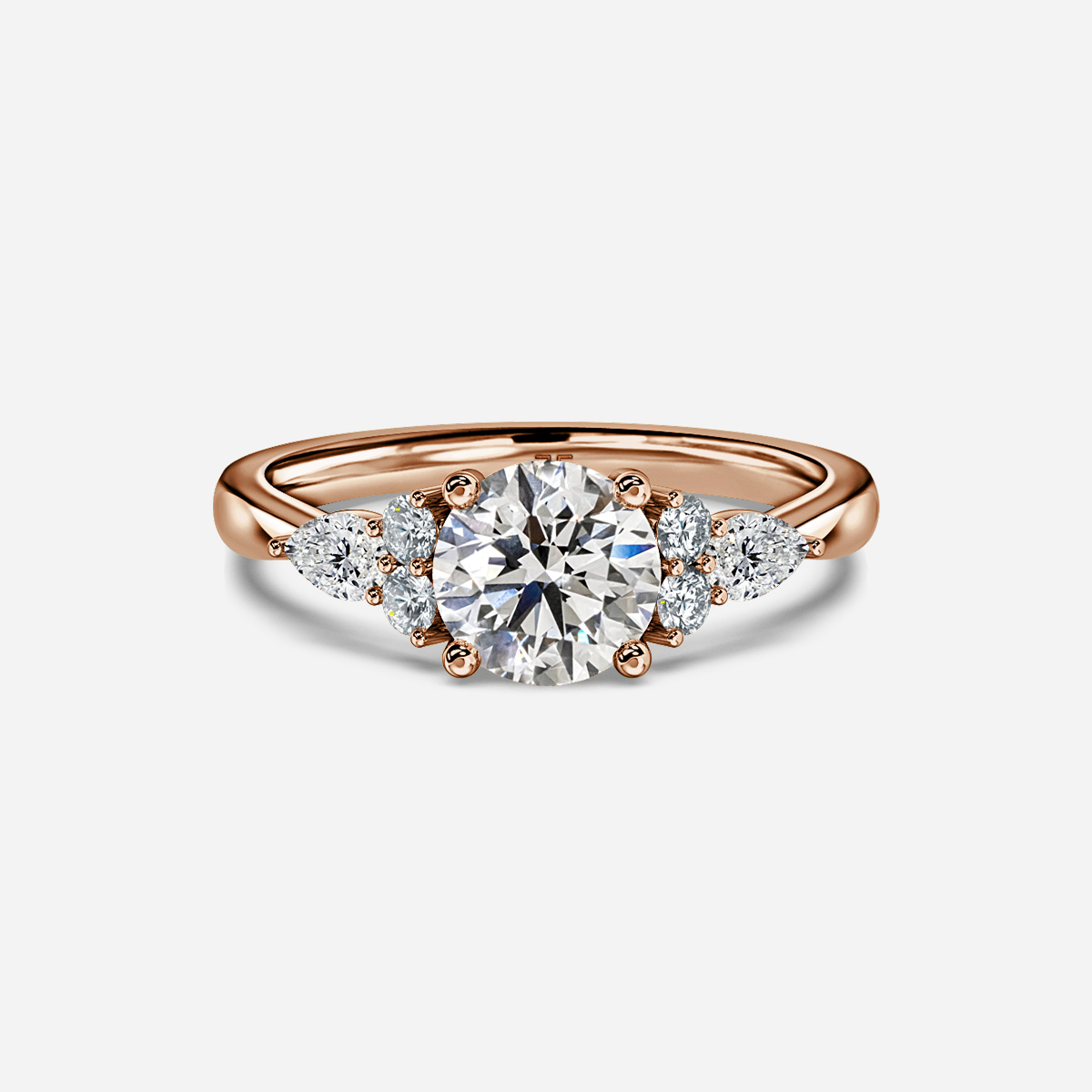 The Nanami sports a pair of pear shaped diamonds nestled next to brilliant round stones on its rounded side with the tip of the pears coming to a perfect point to meet the tapered band. Handcrafted in Hatton Garden, London. Centre Diamond Not Included, Setting only.