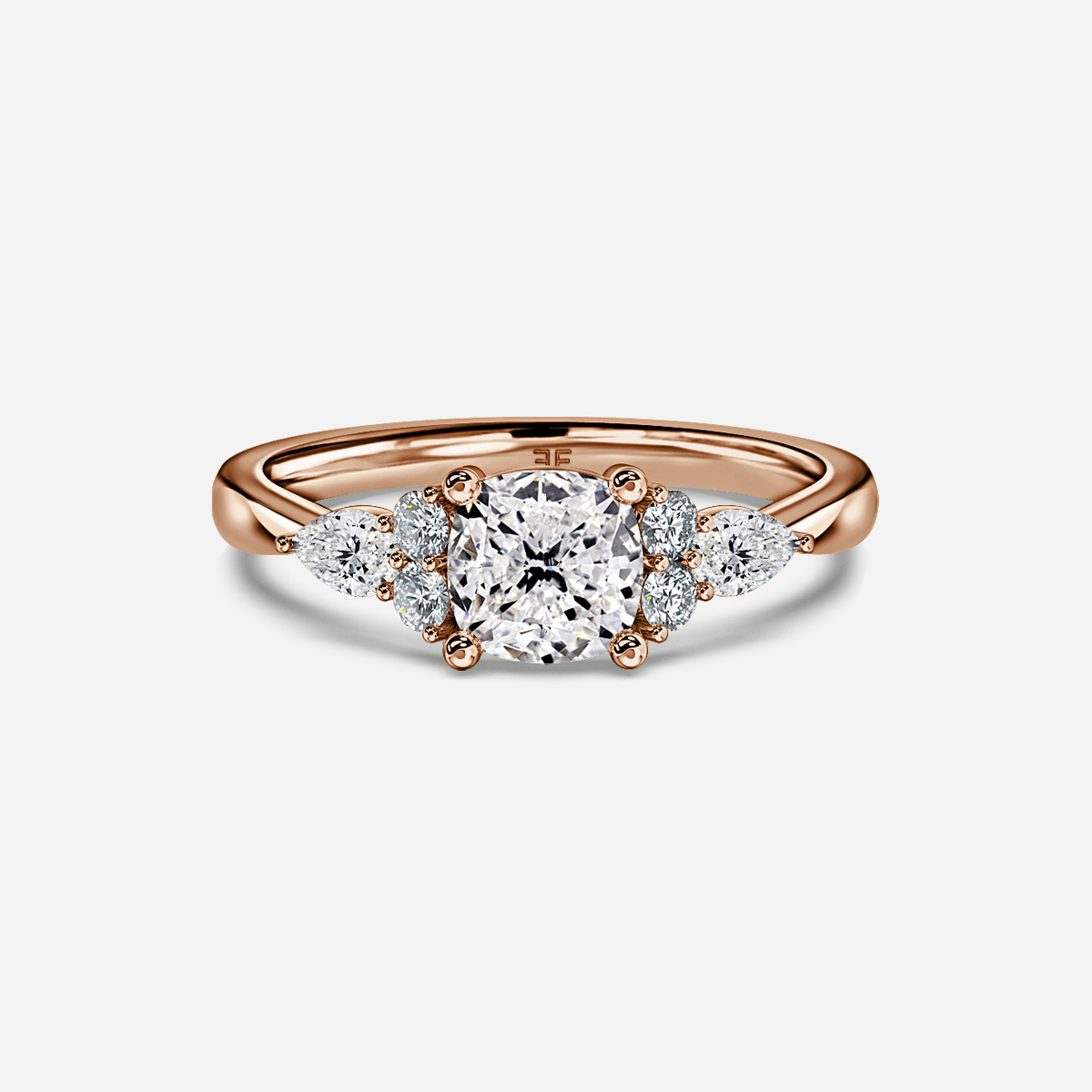 The Nanami sports a pair of pear shaped diamonds nestled next to brilliant round stones on its rounded side with the tip of the pears coming to a perfect point to meet the tapered band. Handcrafted in Hatton Garden, London. Centre Diamond Not Included, Setting only.