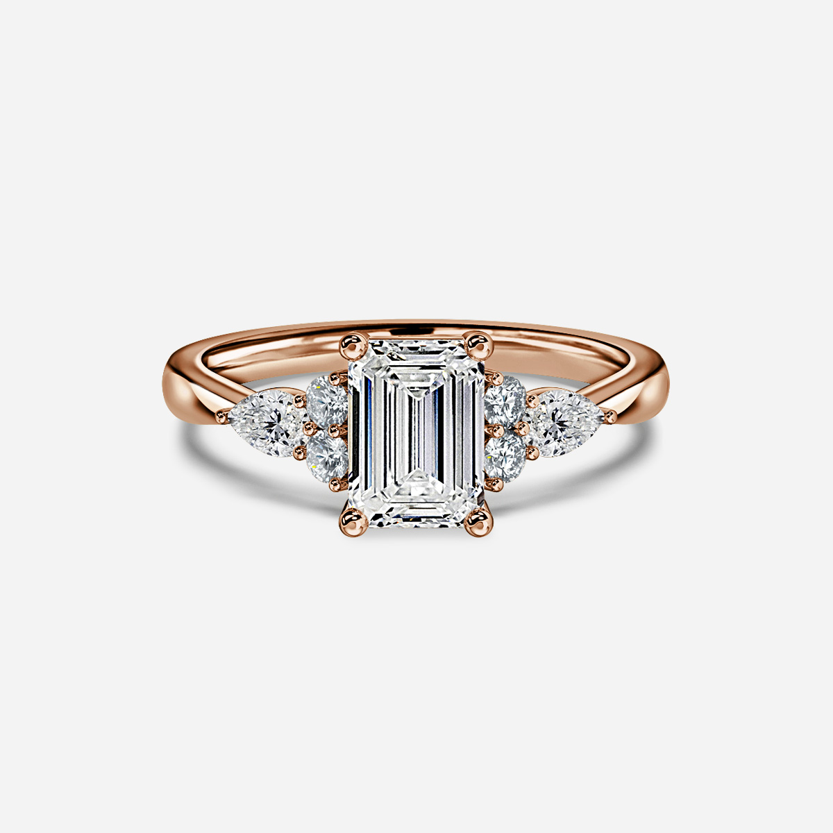 The Nanami sports a pair of pear shaped diamonds nestled next to brilliant round stones on its rounded side with the tip of the pears coming to a perfect point to meet the tapered band. Handcrafted in Hatton Garden, London. Centre Diamond Not Included, Setting only.
