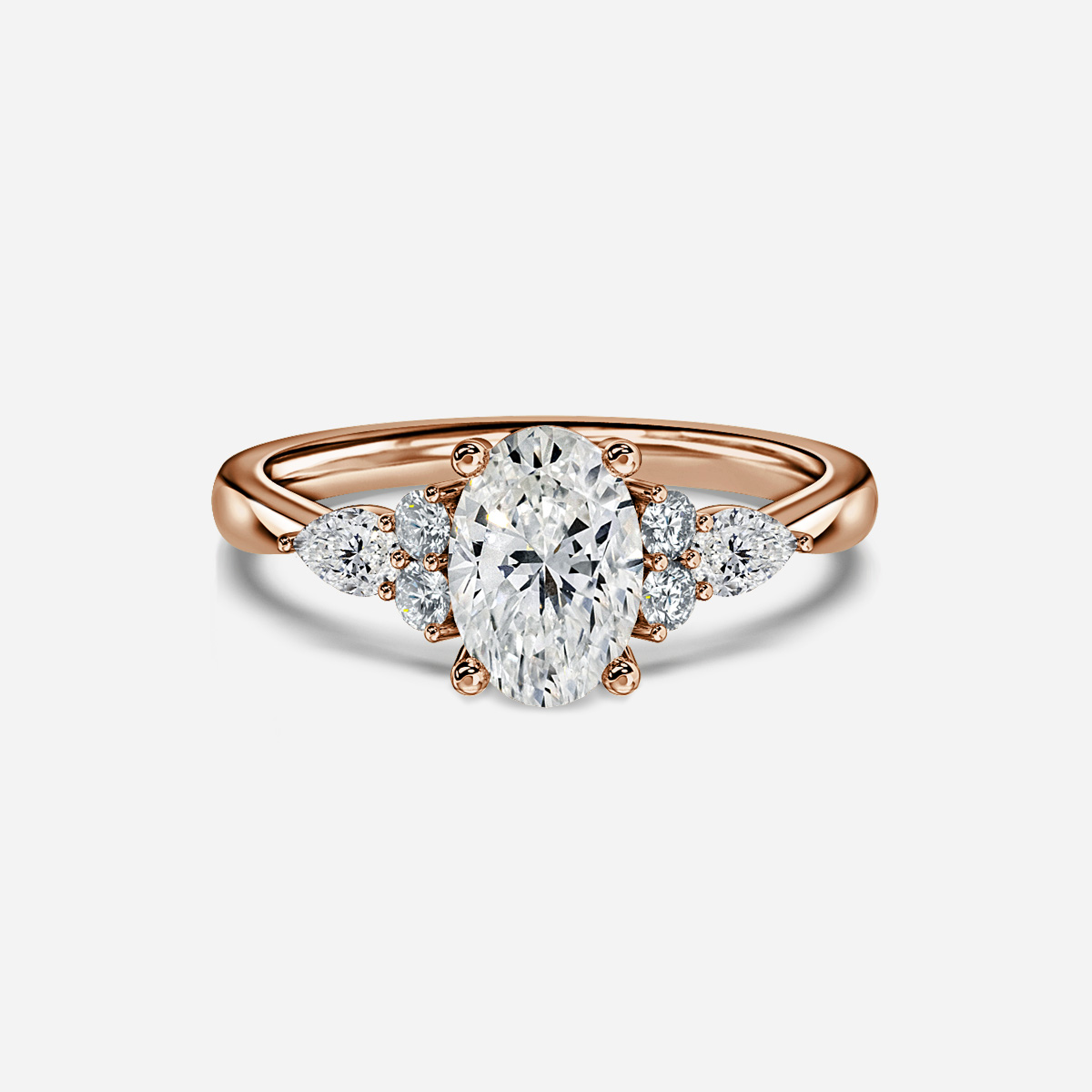 The Nanami sports a pair of pear shaped diamonds nestled next to brilliant round stones on its rounded side with the tip of the pears coming to a perfect point to meet the tapered band. Handcrafted in Hatton Garden, London. Centre Diamond Not Included, Setting only.