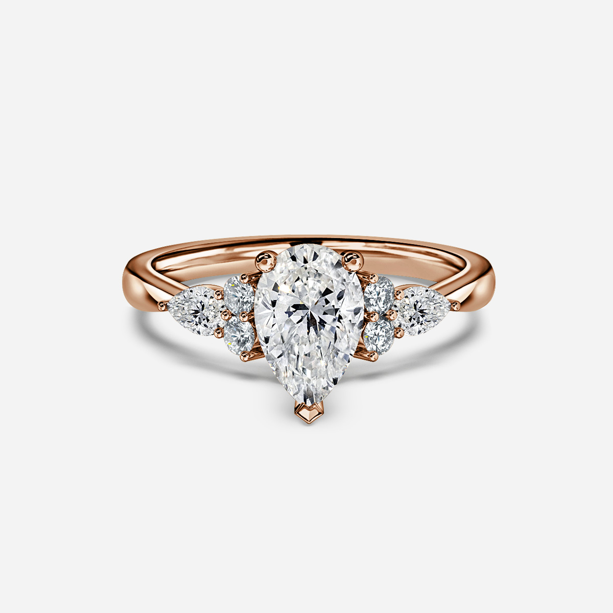The Nanami sports a pair of pear shaped diamonds nestled next to brilliant round stones on its rounded side with the tip of the pears coming to a perfect point to meet the tapered band. Handcrafted in Hatton Garden, London. Centre Diamond Not Included, Setting only.