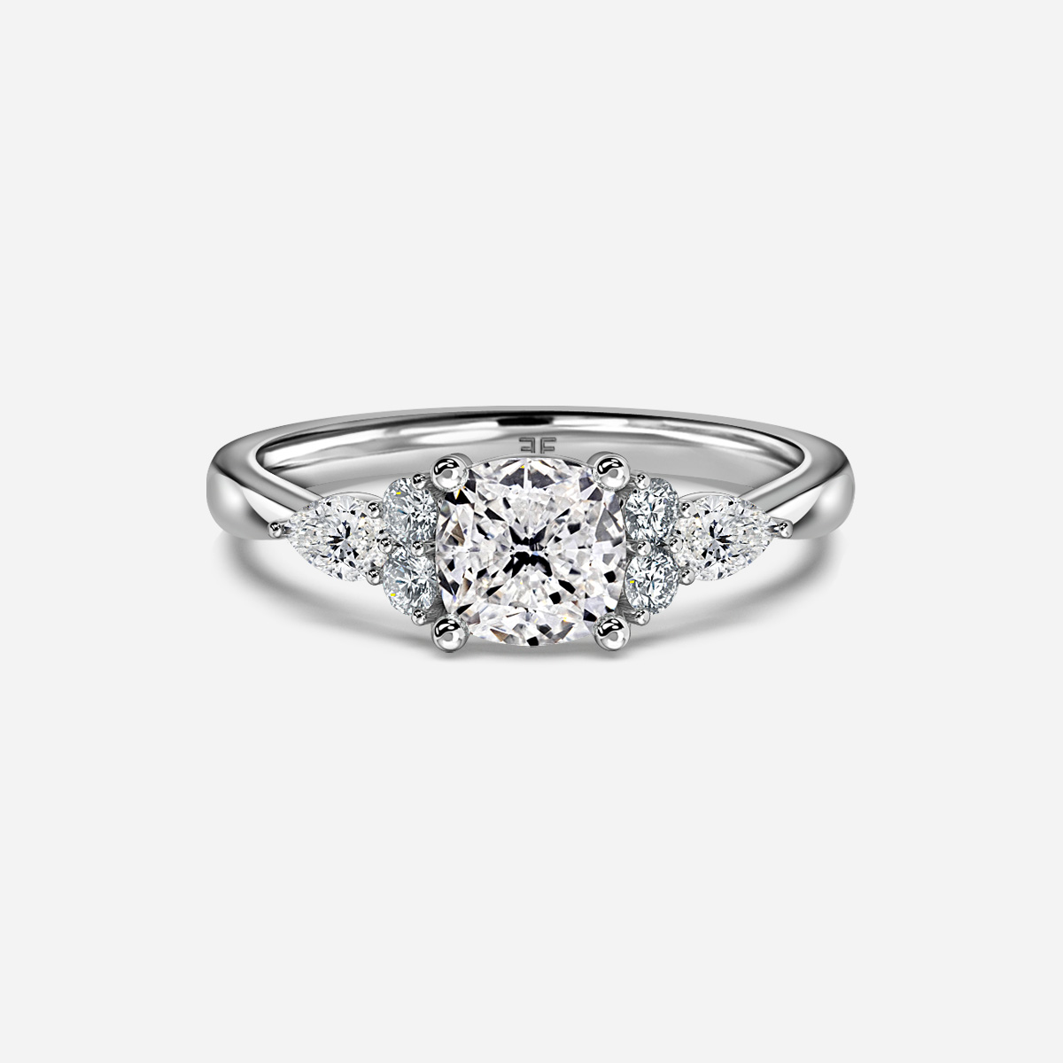 The Nanami sports a pair of pear shaped diamonds nestled next to brilliant round stones on its rounded side with the tip of the pears coming to a perfect point to meet the tapered band. Handcrafted in Hatton Garden, London. Centre Diamond Not Included, Setting only.
