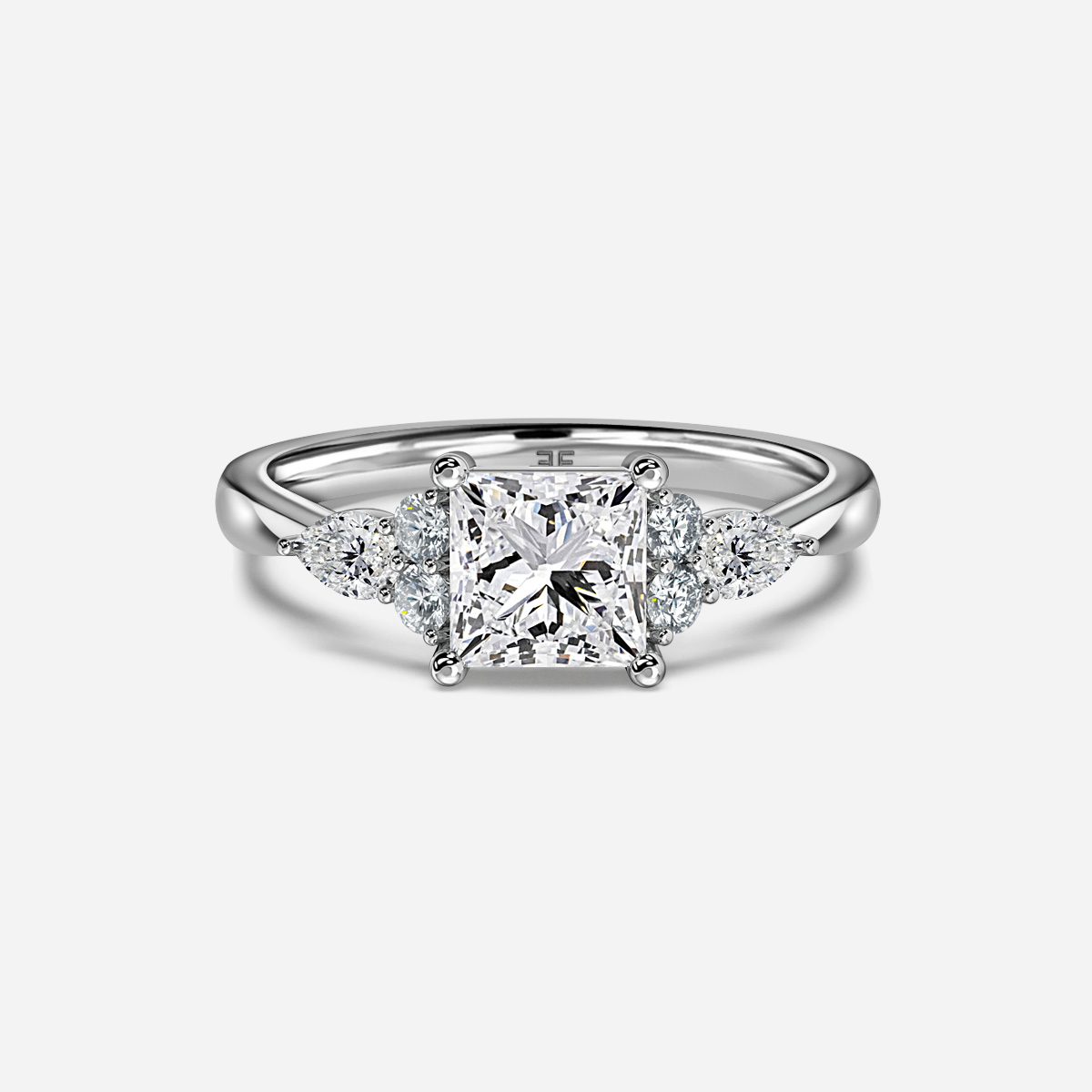 The Nanami sports a pair of pear shaped diamonds nestled next to brilliant round stones on its rounded side with the tip of the pears coming to a perfect point to meet the tapered band. Handcrafted in Hatton Garden, London. Centre Diamond Not Included, Setting only.