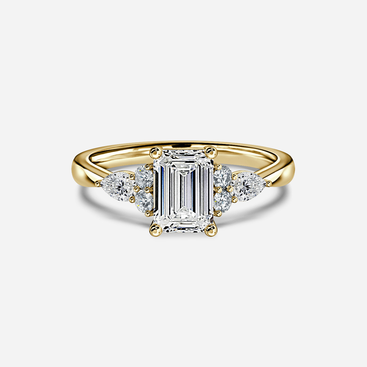 The Nanami sports a pair of pear shaped diamonds nestled next to brilliant round stones on its rounded side with the tip of the pears coming to a perfect point to meet the tapered band. Handcrafted in Hatton Garden, London. Centre Diamond Not Included, Setting only.