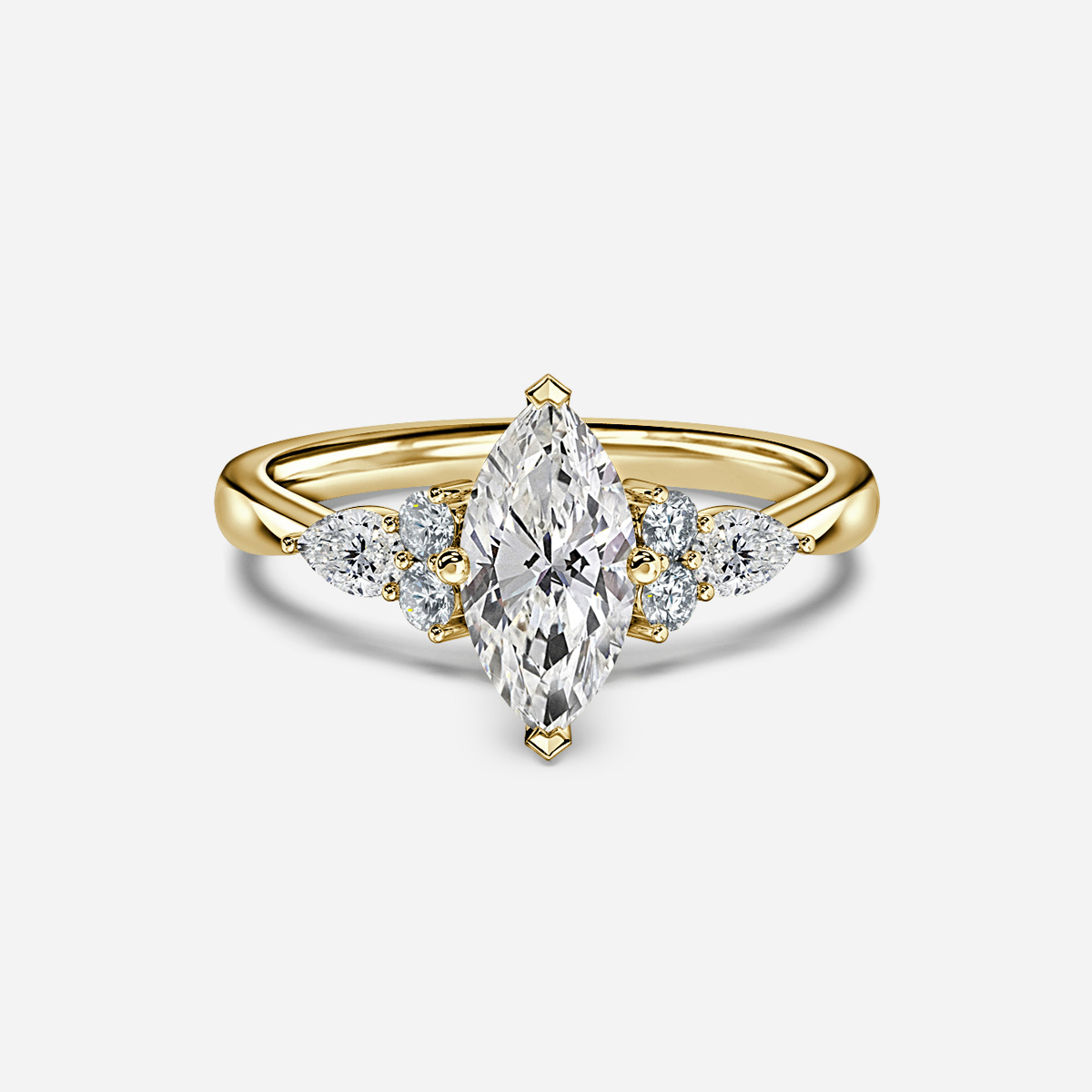 The Nanami sports a pair of pear shaped diamonds nestled next to brilliant round stones on its rounded side with the tip of the pears coming to a perfect point to meet the tapered band. Handcrafted in Hatton Garden, London. Centre Diamond Not Included, Setting only.