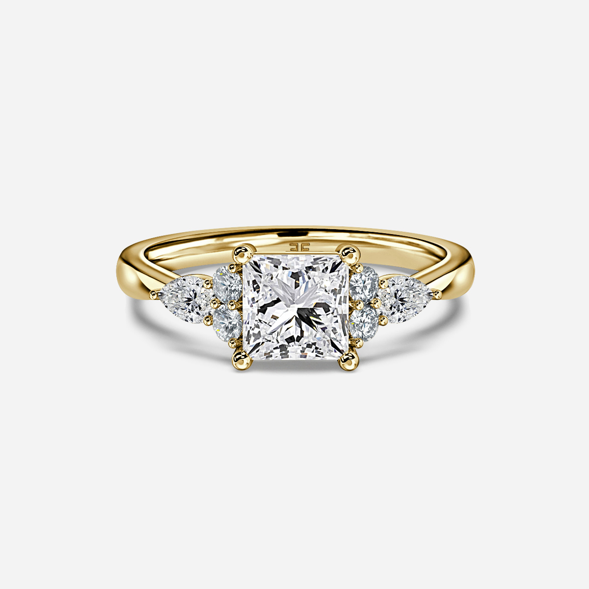 The Nanami sports a pair of pear shaped diamonds nestled next to brilliant round stones on its rounded side with the tip of the pears coming to a perfect point to meet the tapered band. Handcrafted in Hatton Garden, London. Centre Diamond Not Included, Setting only.