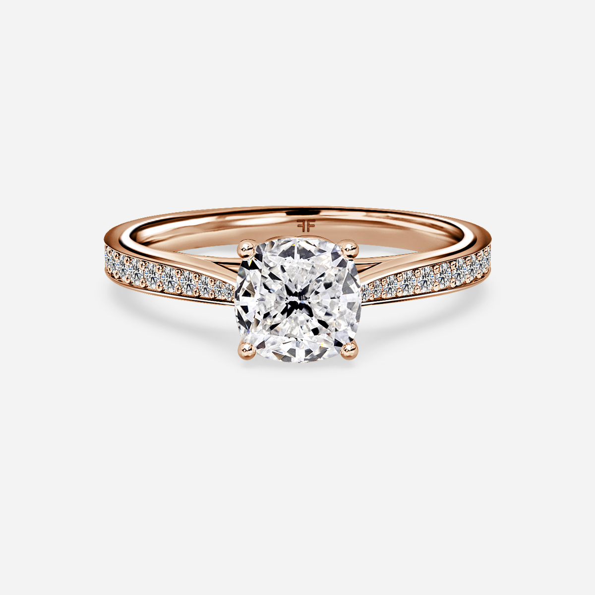 This tapered grain set engagement rings feature a stylish design with a narrowing band adorned by a row of small, sparkling diamonds, creating an elegant and sophisticated look for the center stone. This setting combines modern aesthetics with a touch of vintage charm, making it a popular choice for those seeking a unique and eye-catching engagement ring. Handcrafted in Hatton Garden, London Centre Diamond Not Included Setting Only