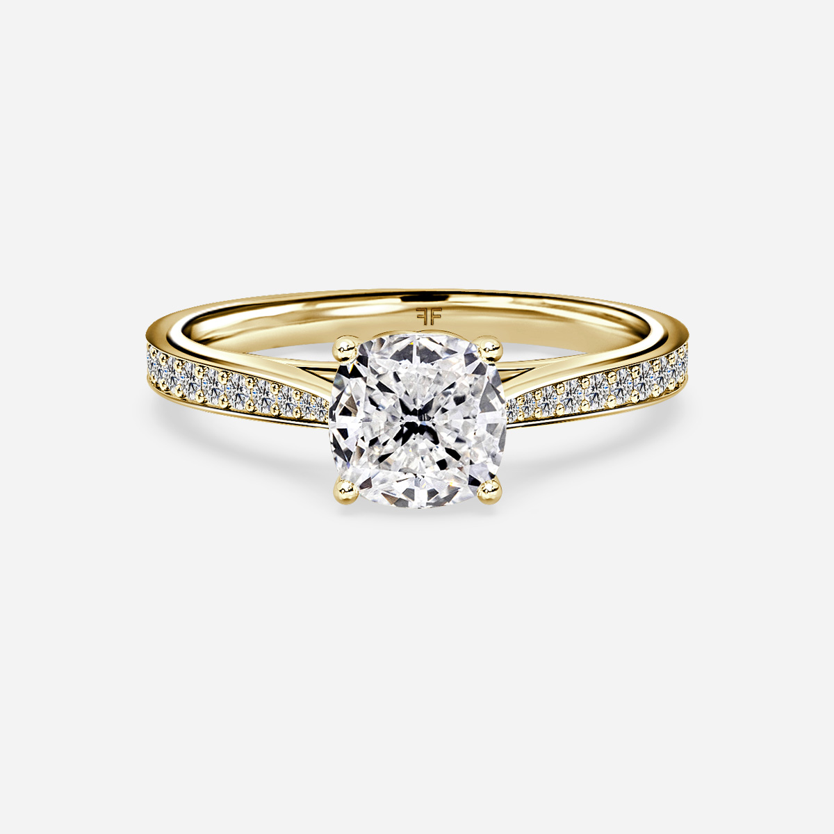This tapered grain set engagement rings feature a stylish design with a narrowing band adorned by a row of small, sparkling diamonds, creating an elegant and sophisticated look for the center stone. This setting combines modern aesthetics with a touch of vintage charm, making it a popular choice for those seeking a unique and eye-catching engagement ring. Handcrafted in Hatton Garden, London Centre Diamond Not Included Setting Only