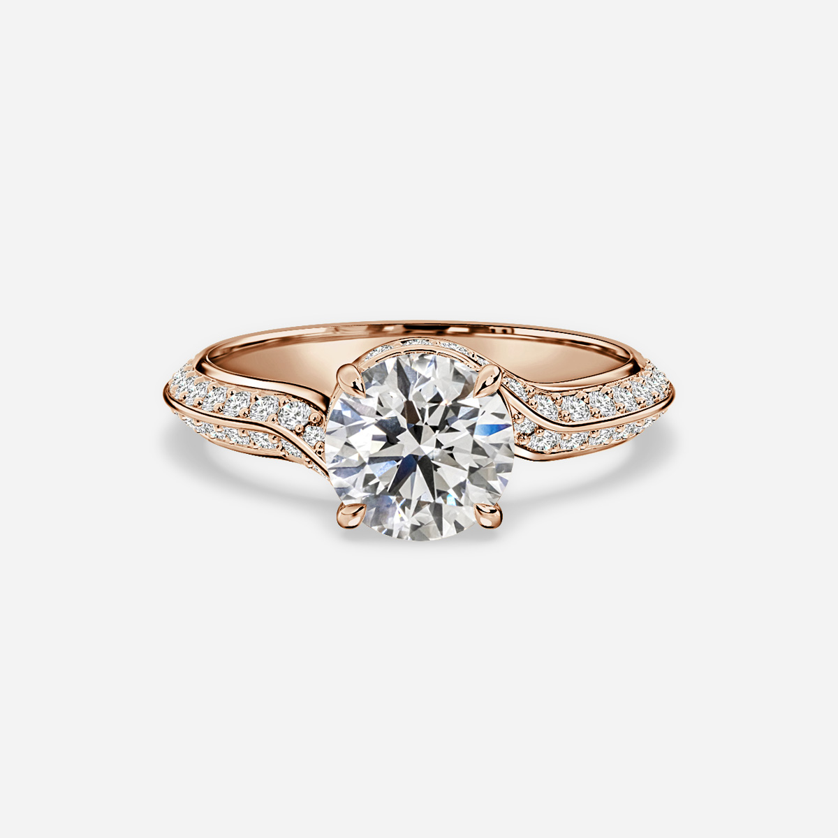 This stunning rose gold engagement ring features a majestic ribbon of pave set diamond from the base of the ring to the center diamond acting as the nexus. It also feature a hidden halo of small round diamonds. Handcrafted in Hatton Gardens, London Setting Only