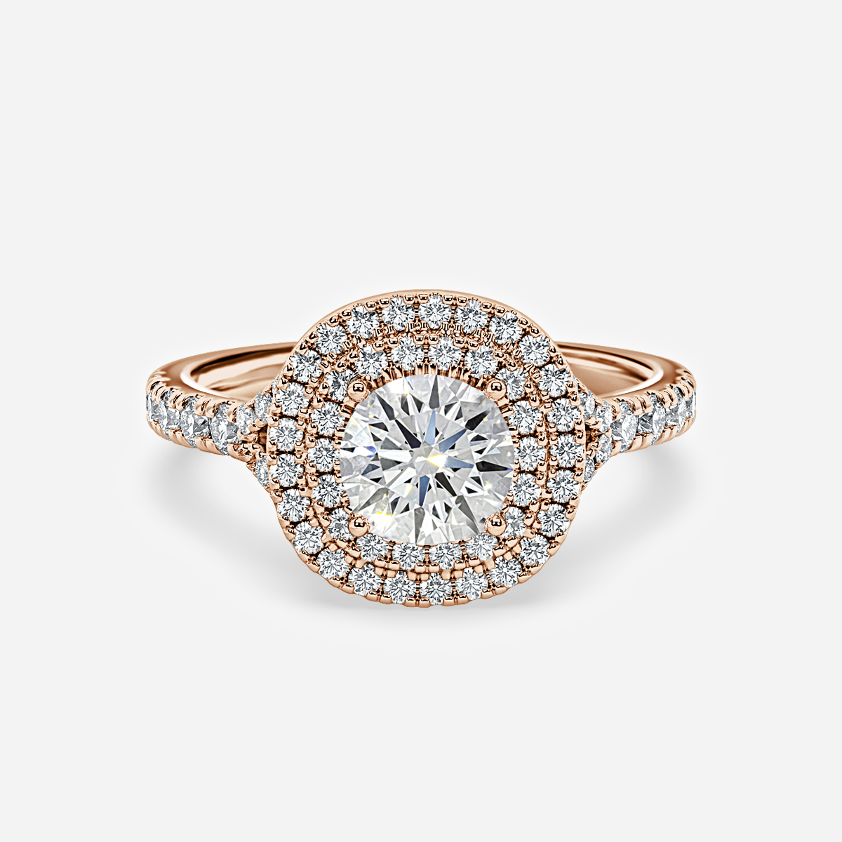 A rose gold engagement ring features a split shank covered in pave diamonds and a stunning double halo, perfect for expressing your love and commitment. Handcrafted in Hatton Gardens, London. Centre Diamond Not Included Setting only