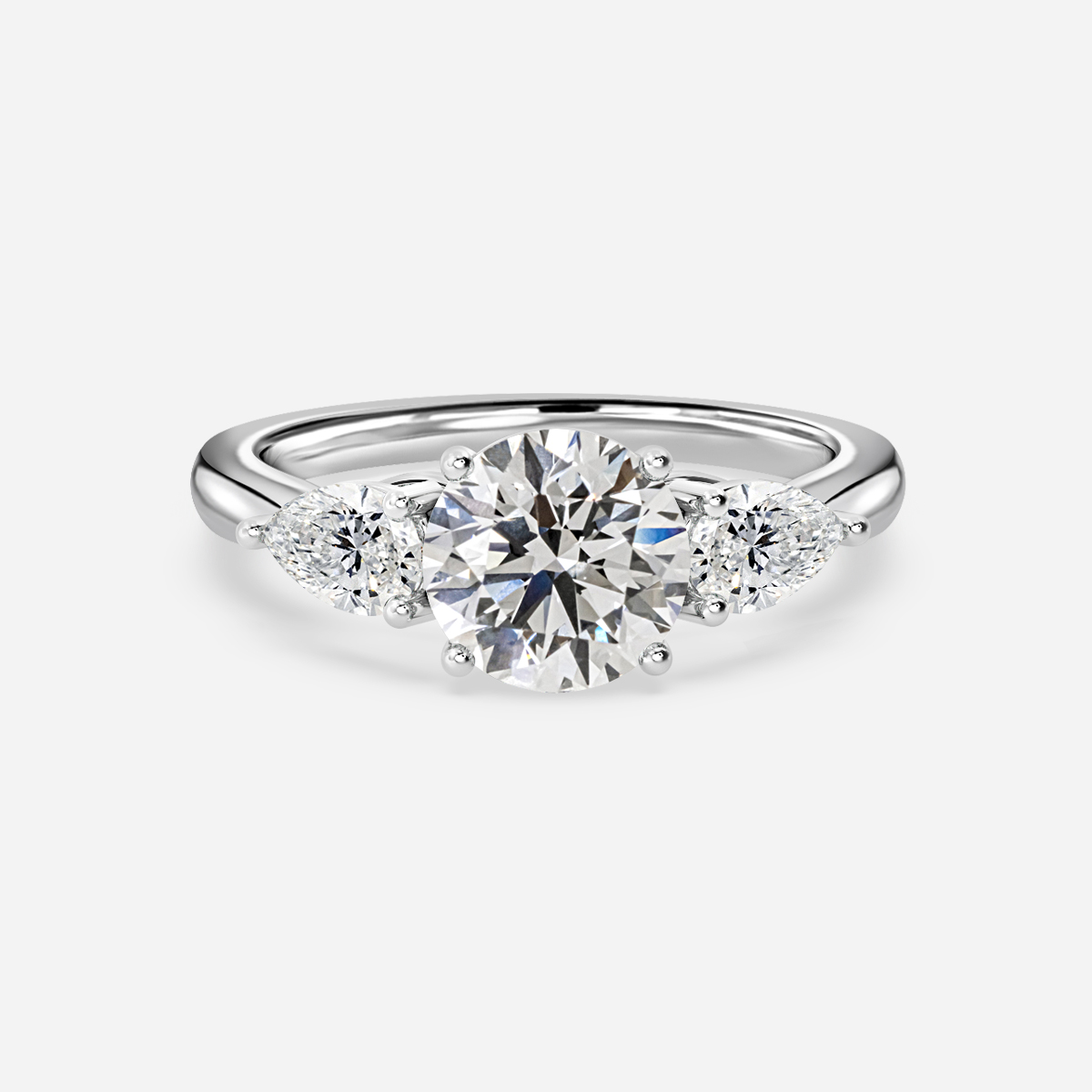 The Nimi engagement ring is held in a classic four-prong setting. This ring features two exquisite side stone pear diamonds that enhance the centre stone, telling the past, present and future tale of your relationship. Handcrafted in Hatton Gardens, London. Centre Diamond Not Included Setting only