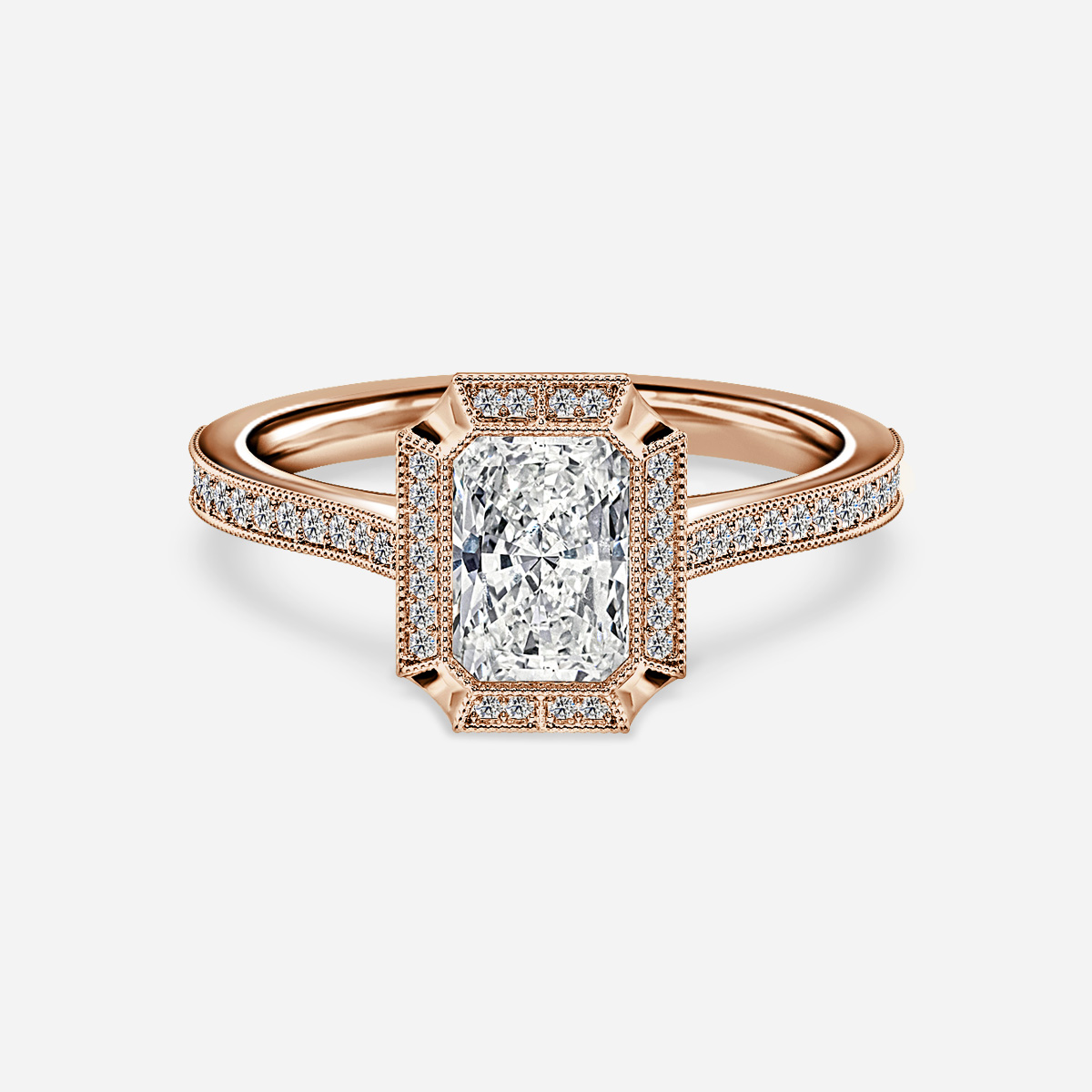 A milgrain bezel set halo engagement ring is a stunning and intricate design featuring a central gemstone encircled by a row of smaller diamonds, all held in place by a delicate milgrain-edged bezel setting.The band is further adorned with shimmering diamonds and milgrain detailing, creating a captivating and timeless symbol of love. Handcrafted in Hatton Garden, London Centre Diamond Not Included Setting Only