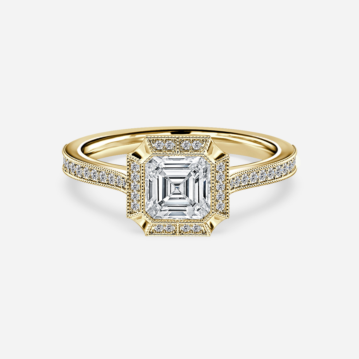 A milgrain bezel set halo engagement ring is a stunning and intricate design featuring a central gemstone encircled by a row of smaller diamonds, all held in place by a delicate milgrain-edged bezel setting.The band is further adorned with shimmering diamonds and milgrain detailing, creating a captivating and timeless symbol of love. Handcrafted in Hatton Garden, London Centre Diamond Not Included Setting Only